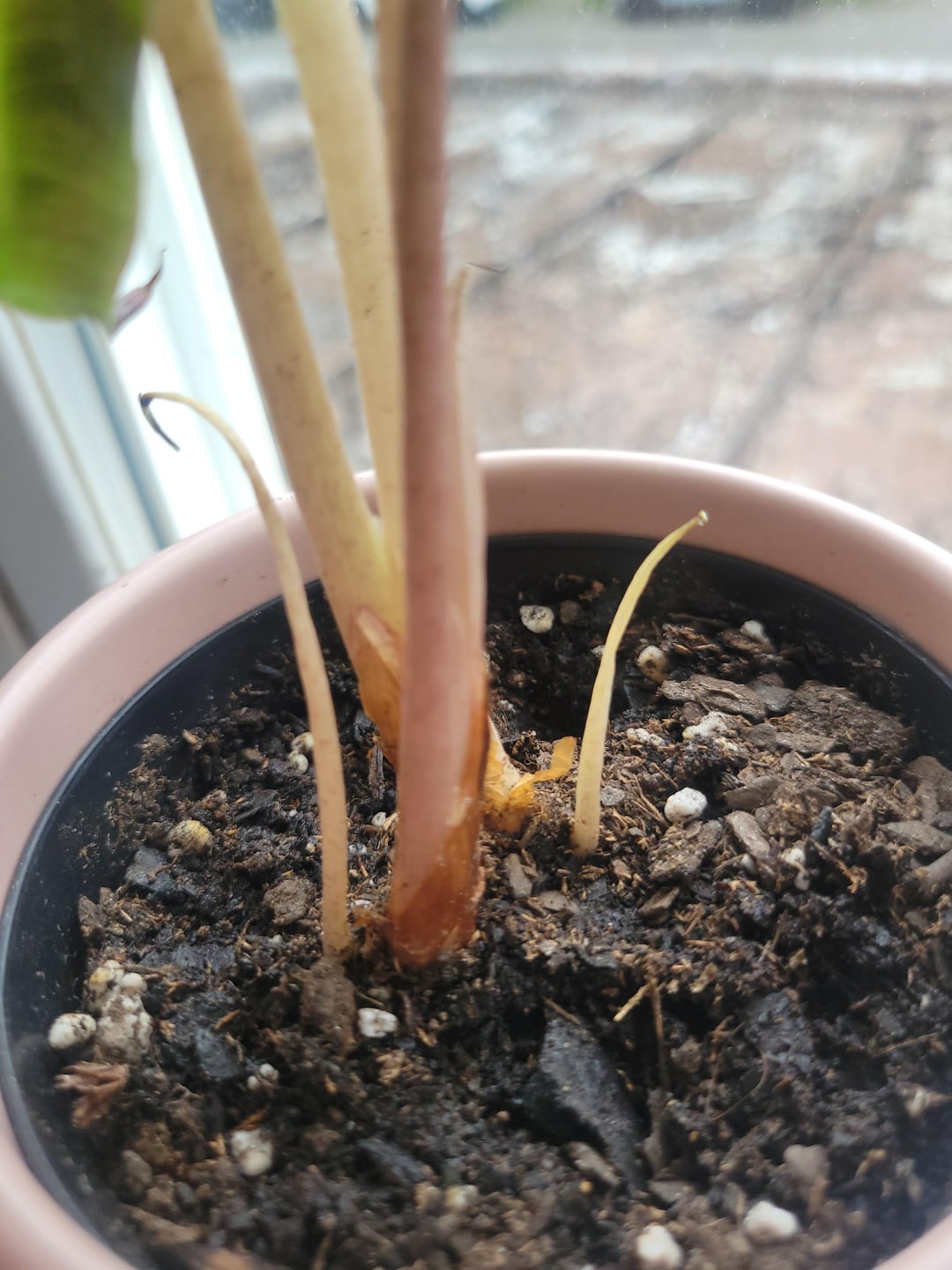 Da die Erde durchnässt war und ich Angst vor Wurzelfäule hatte, habe ich sie in Happy Frog (alles, was ich hatte) umgetopft und versucht, die Erde dort so locker und luftig wie möglich zu halten