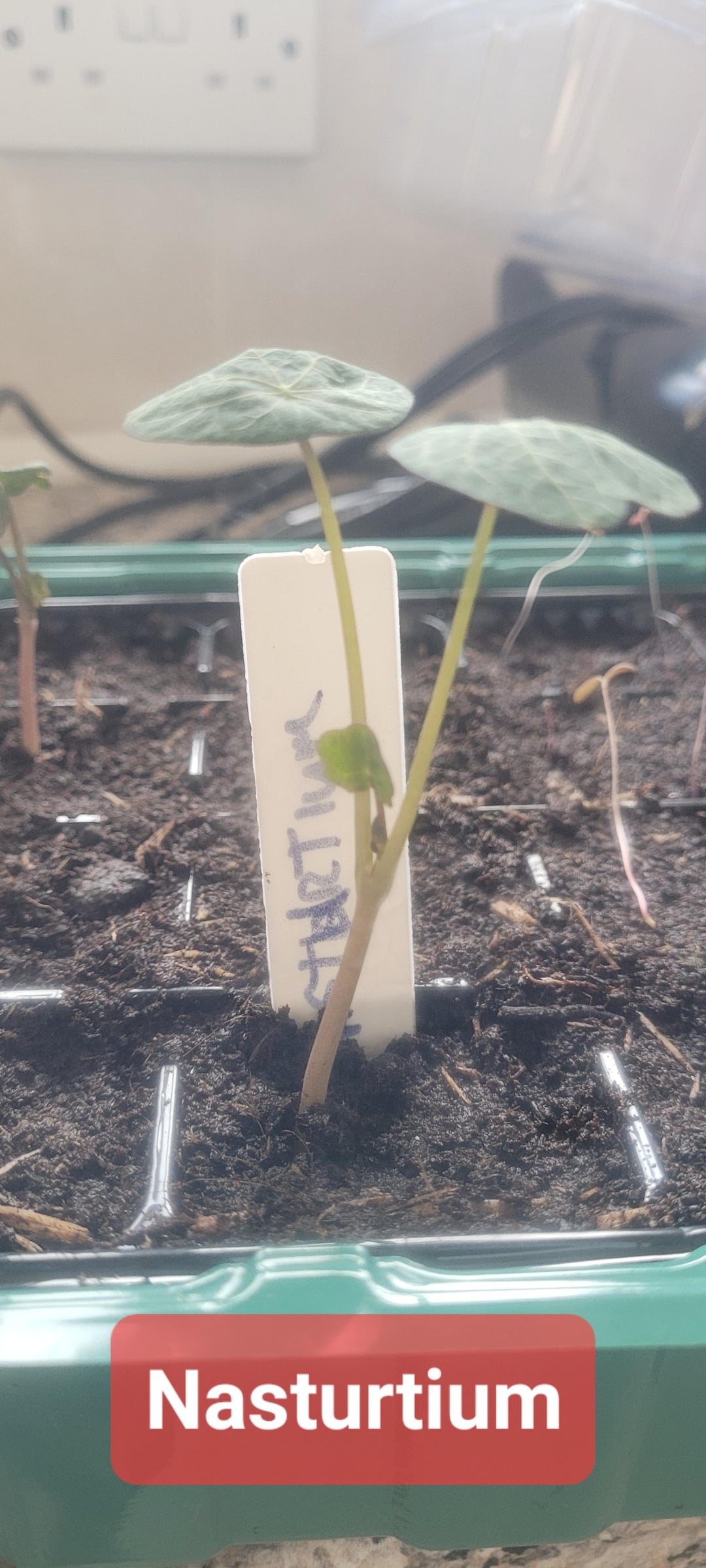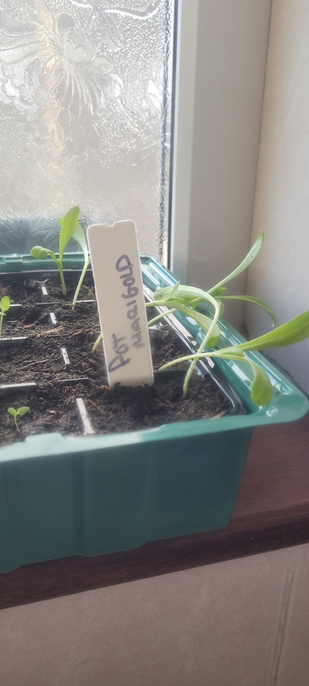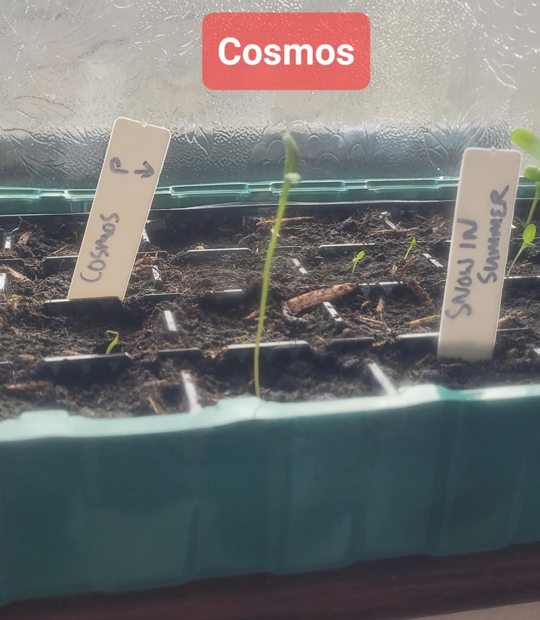 Alles außer dem Kosmos und der Ringelblume wird an nach Süden ausgerichteten, durchsichtigen Fenstern mit Wachstumslampen angebaut.