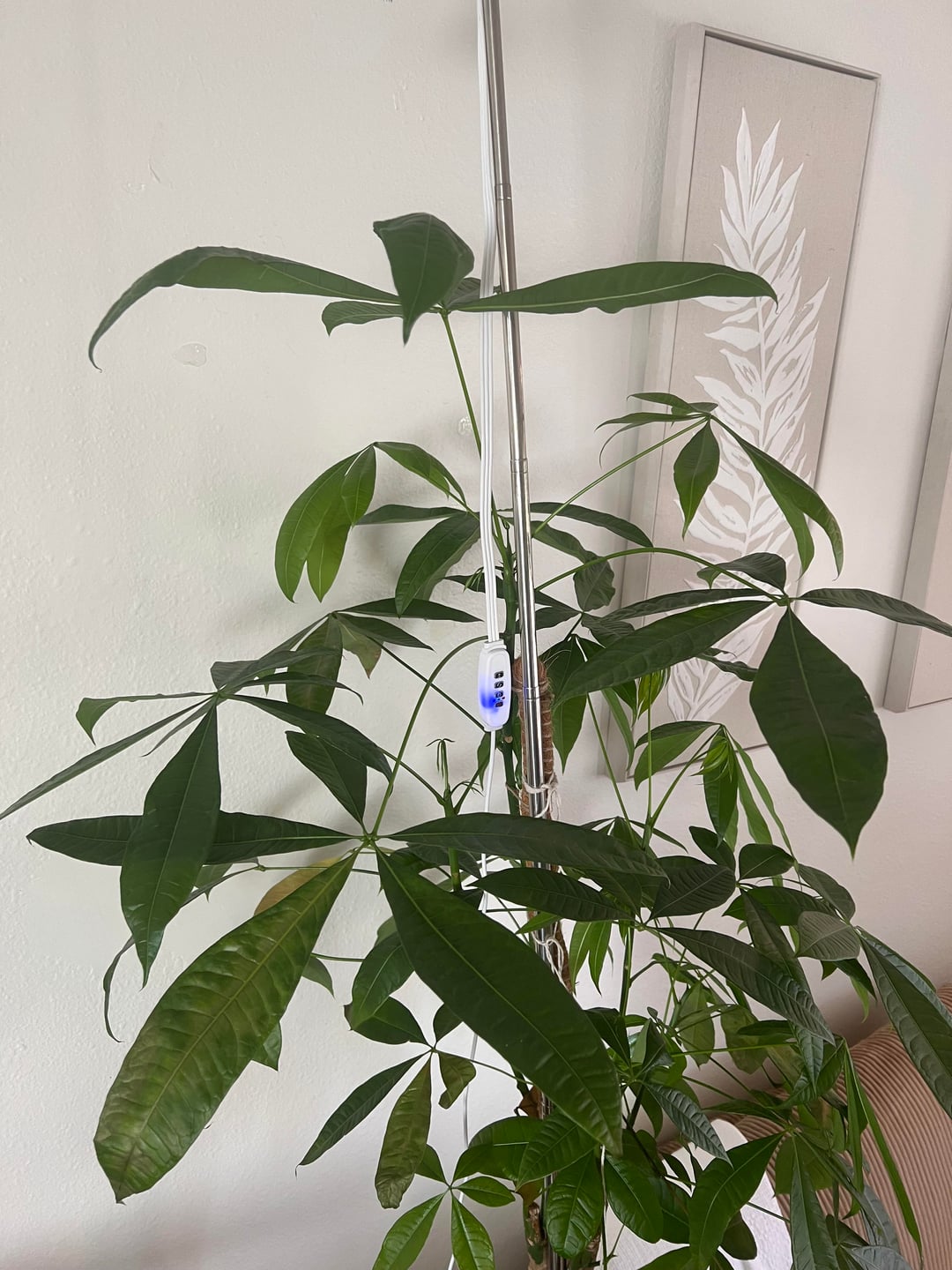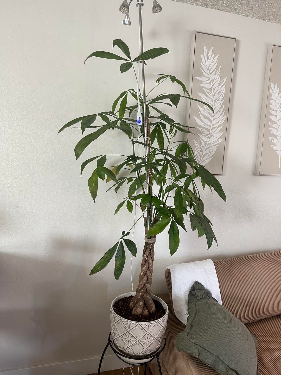 Sometimes the plant is tied just below the soil line (ive heard it helps with the braided trunk). If you dig down into the soul there might be a rubber band or twist tie that’s causing the plant to do this.