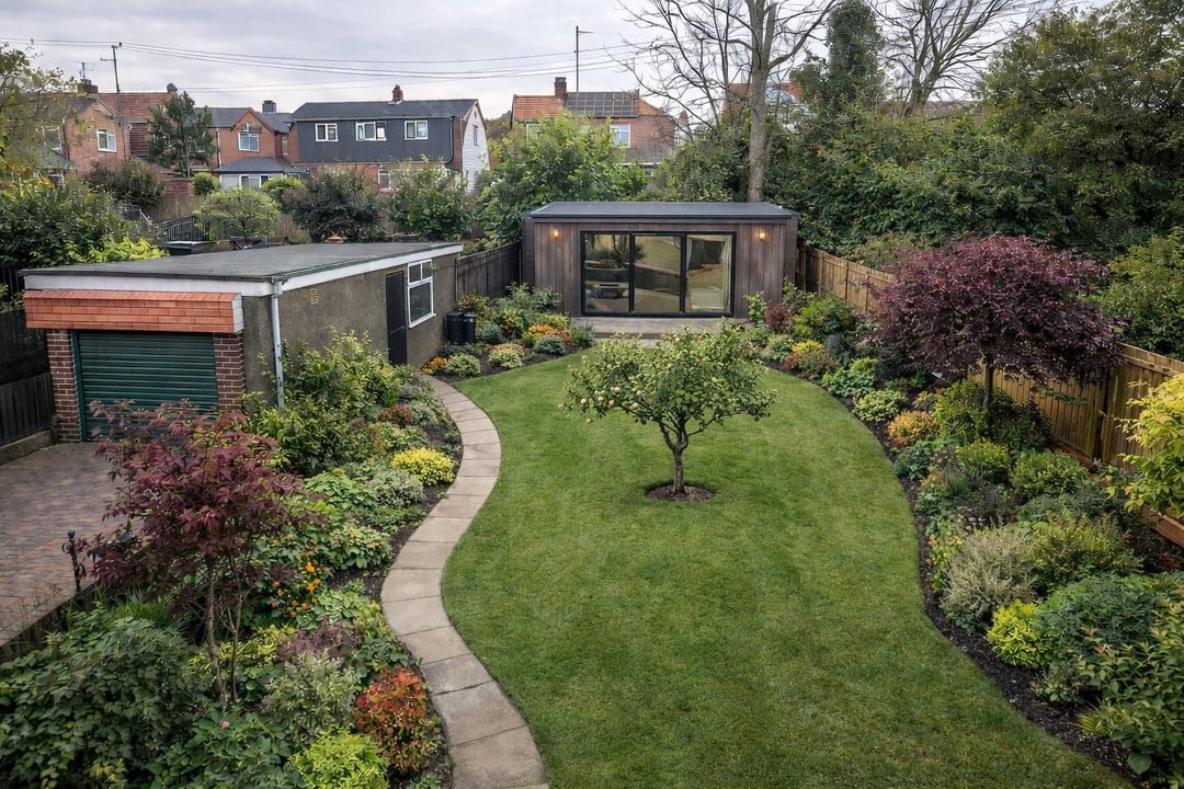 Könnte jemand, der technisch versierter ist als ich, bitte ein Rendering einiger möglicher Layouts erstellen? Unser Ziel ist ein Gartenzimmer auf der Rückseite zwischen der Garage und dem Zaun, und der Apfelbaum müsste bleiben, denn die Äpfel sind köstlich!