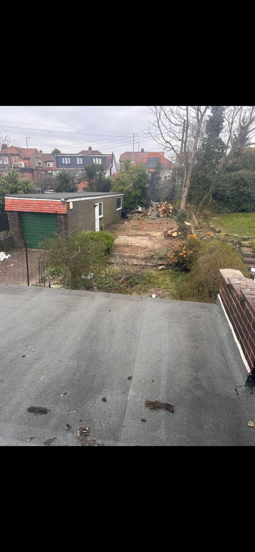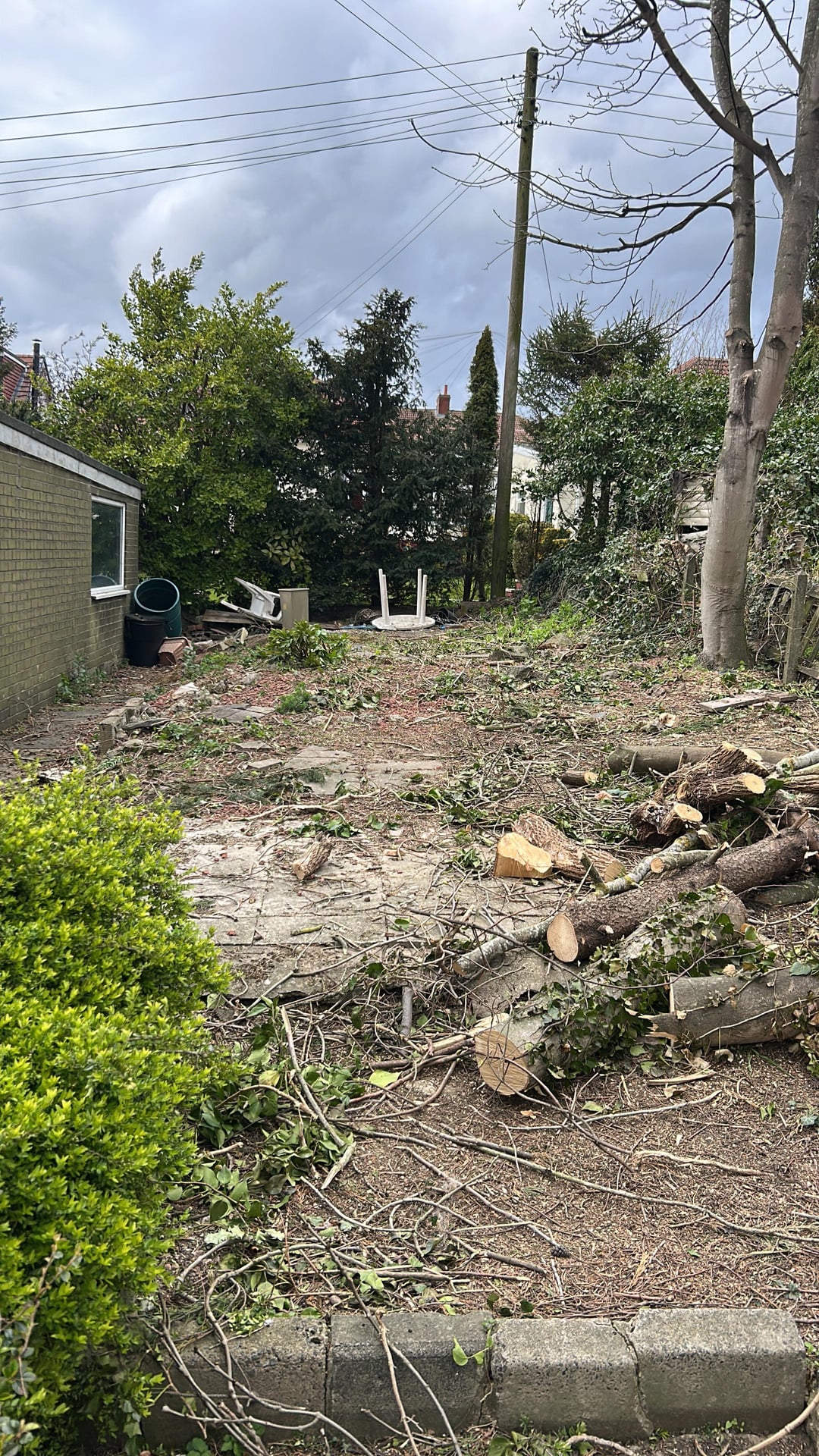 Alle Bäume auf der rechten Seite wurden jetzt entfernt, da die Gartenebene abgesenkt wird, um sie flach und nutzbar zu machen