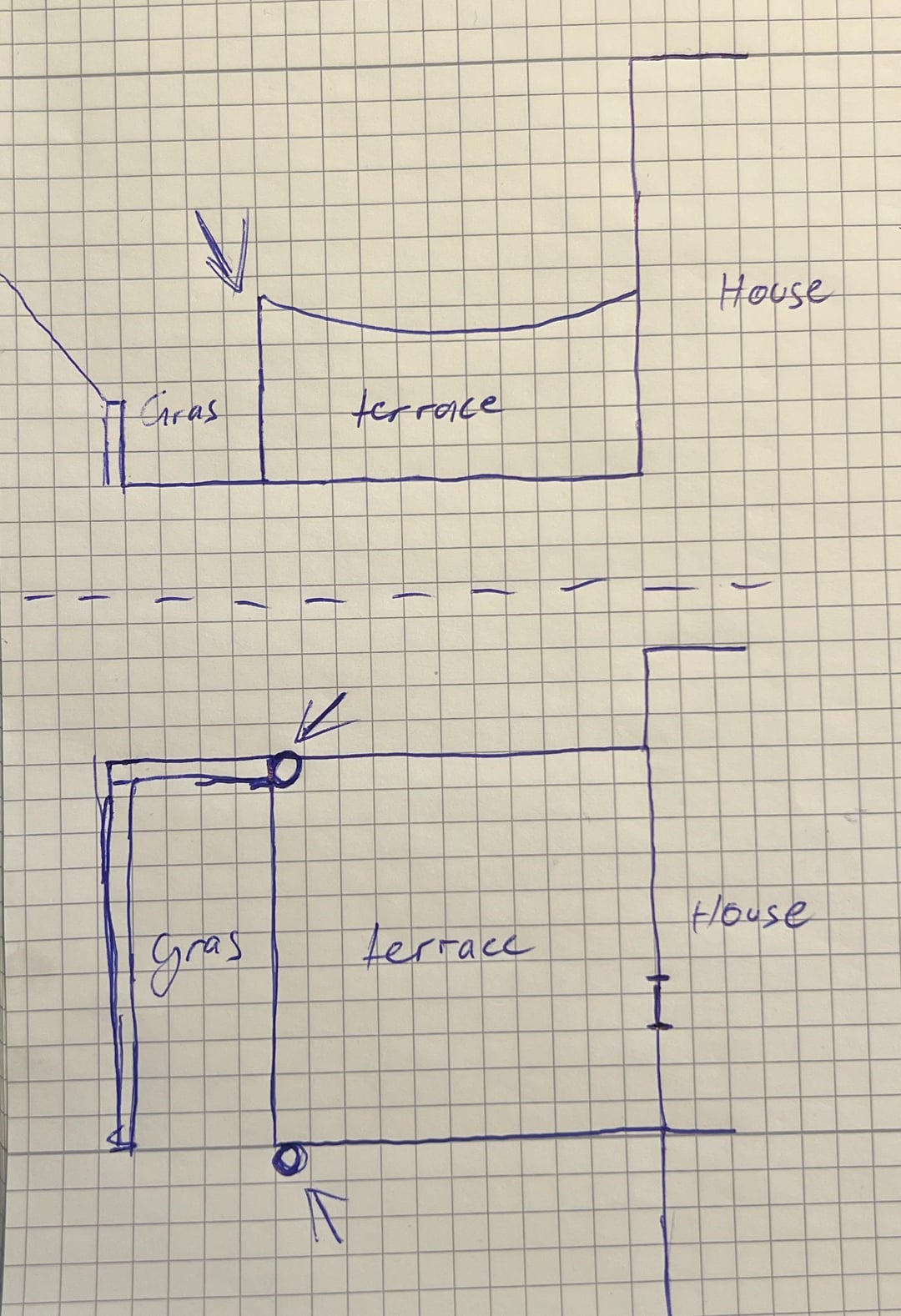 Meine Idee war, einen Pfosten an der Wand im ersten Bild rechts und einen im Boden links im Gras zu verankern und dann einfach Haken an der Hauswand zu verwenden.