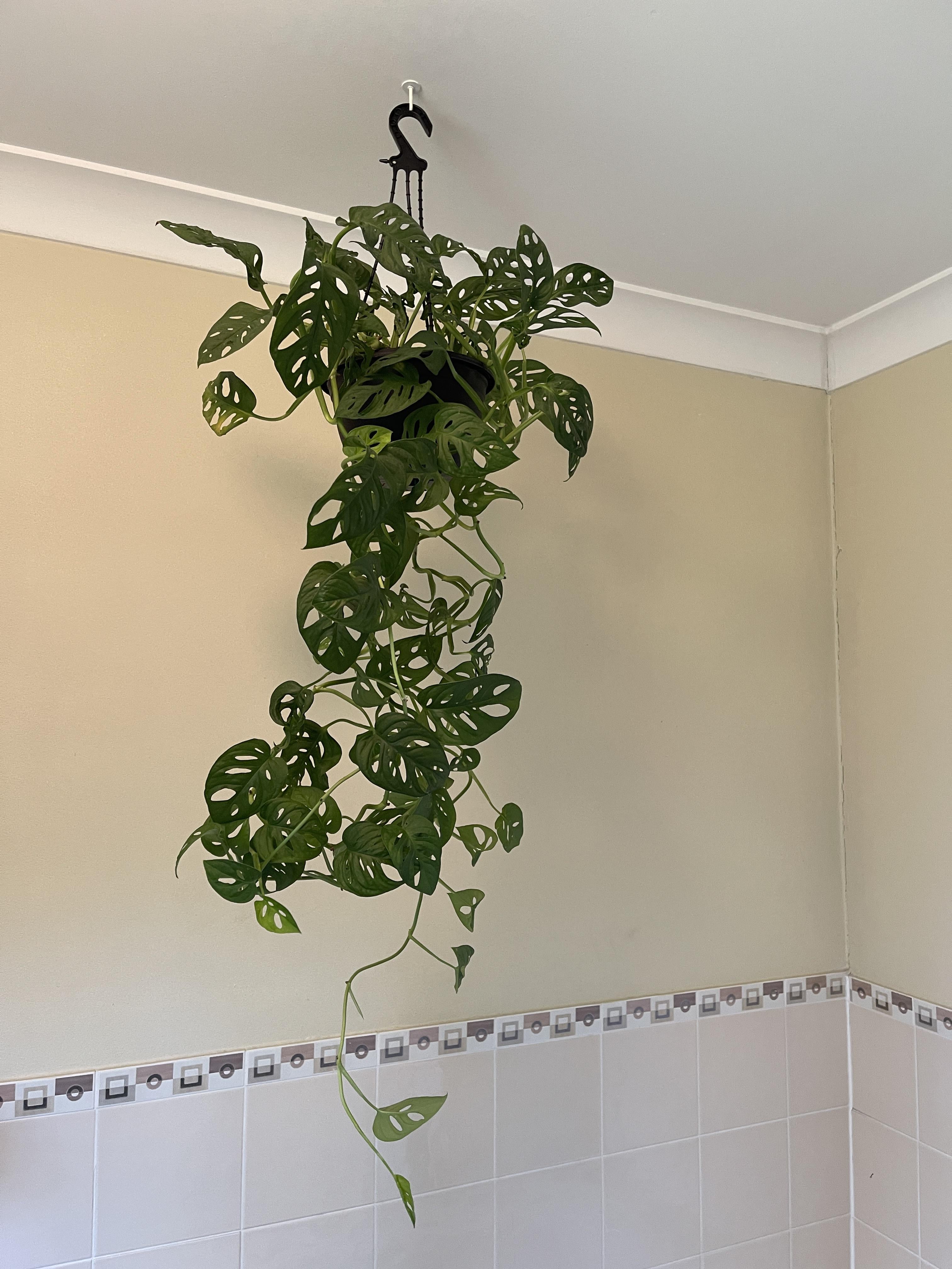 Ich habe dieses hängende „Schweizer Käse“-Monster in meinem Badezimmer. Dort gedeiht es super gut mit dem Dampf und dem Licht, das morgens kommt. Ich bespritze es ständig mit Wasser und gieße es nach Bedarf. Ich frage mich im Grunde, welche anderen Hängepflanzen in derselben Umgebung wie dieser gut gedeihen würden. Ich habe zusätzlichen Platz und einen Ersatzhaken, die nach mir rufen! Ich würde mir einfach ein anderes besorgen, dachte aber, ich würde auch nach anderen Vorschlägen fragen. Danke schön!