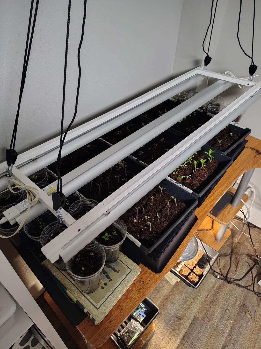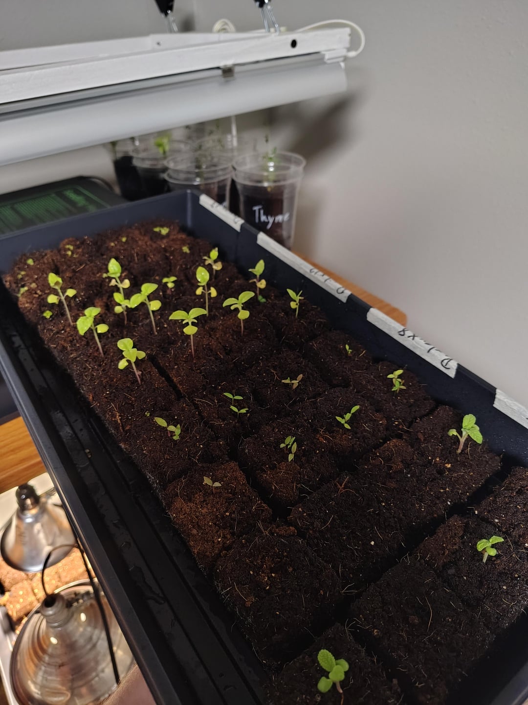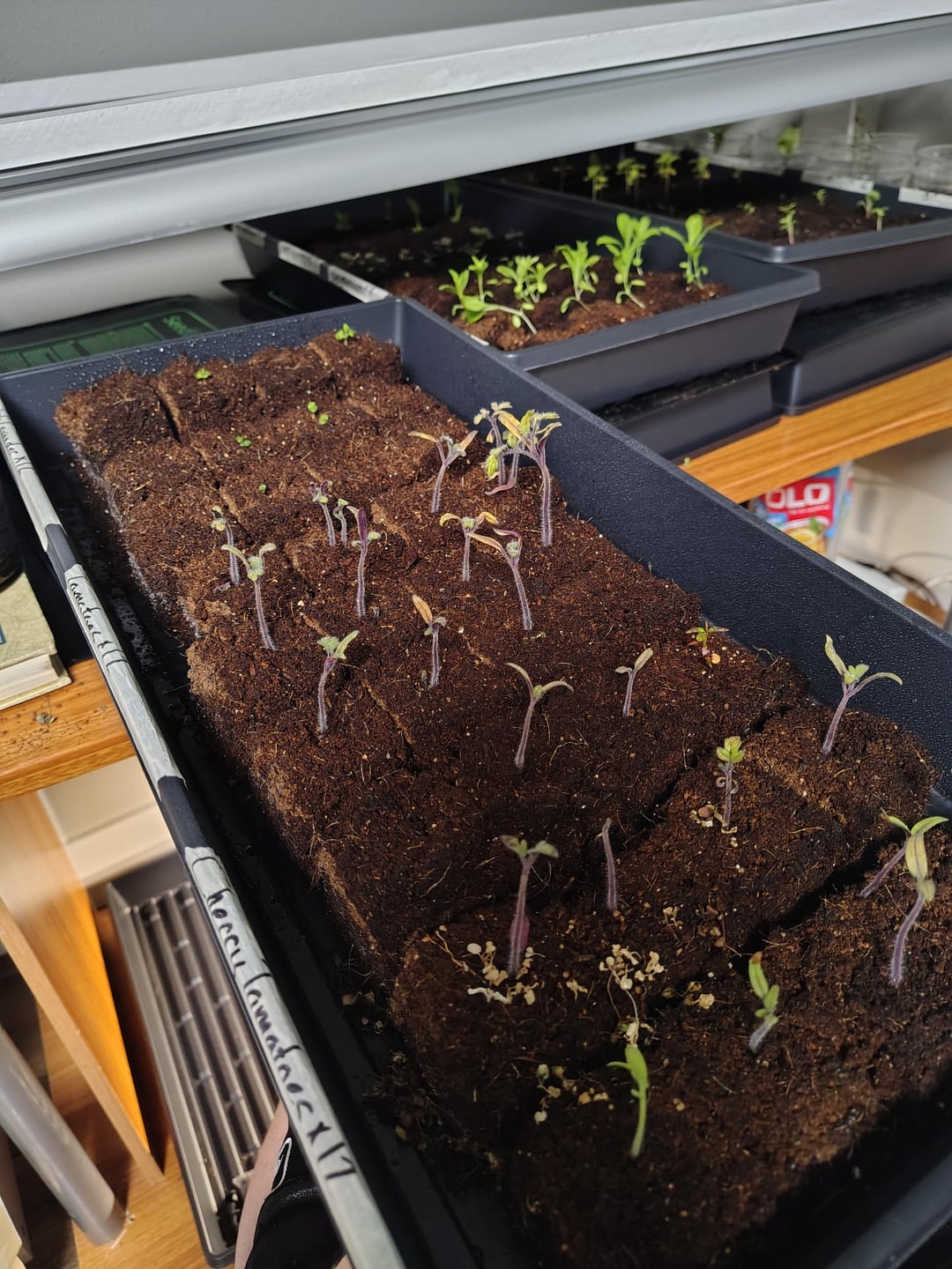 Die Lampe schaltet sich jeden Tag über Nacht etwa 14 Stunden lang ein. Ich bewässere die Schalen regelmäßig jeden zweiten Tag mit etwa einem Liter Wasser pro Schale. Den Sämlingen in den Schalen scheint es besser zu gehen als in den Schalen. Dank im Voraus!