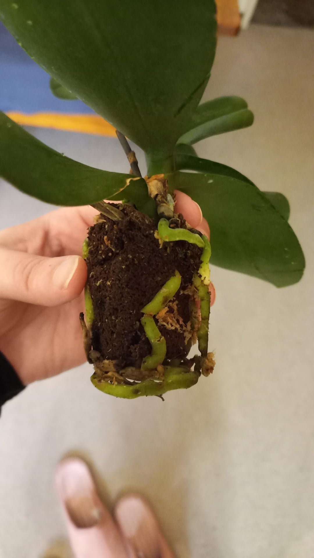 Die Wurzeln wuchsen in der Lücke zwischen Torf und Moos, ein früherer Versuch, dem Torf etwas Luft zu geben, während es noch blühte. Ich wollte nicht zu viel damit herumspielen, solange Blumen drauf waren.