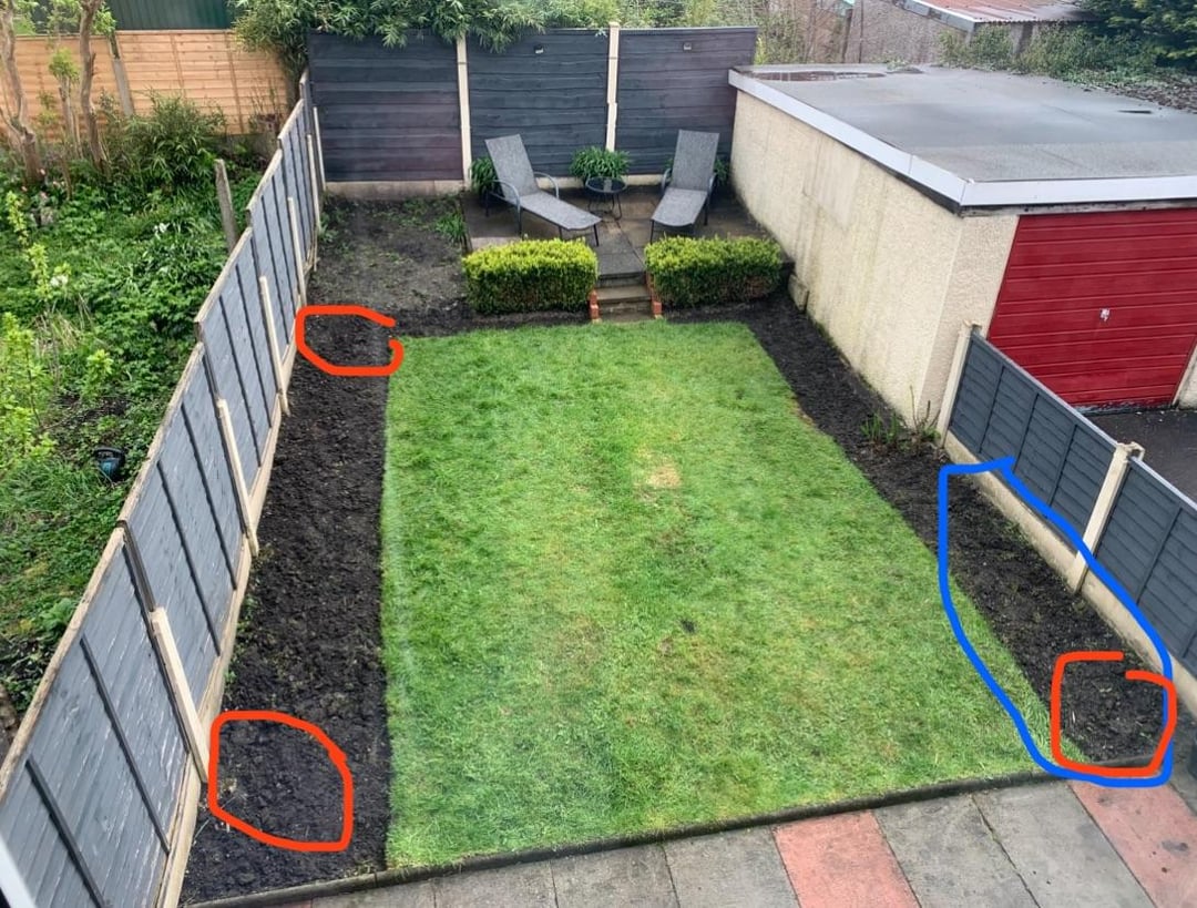 Die roten Kreise im letzten Bild zeigen, wohin ich die Topfbüsche verschieben wollte, und der blau hervorgehobene Bereich ist eine Art „falsches“ Blumenbeet – es gibt nur ein paar Zentimeter Erde, da ich glaube, dass einer der Vorbesitzer versucht hat, den Garten über die Auffahrt hinaus zu erweitern.
