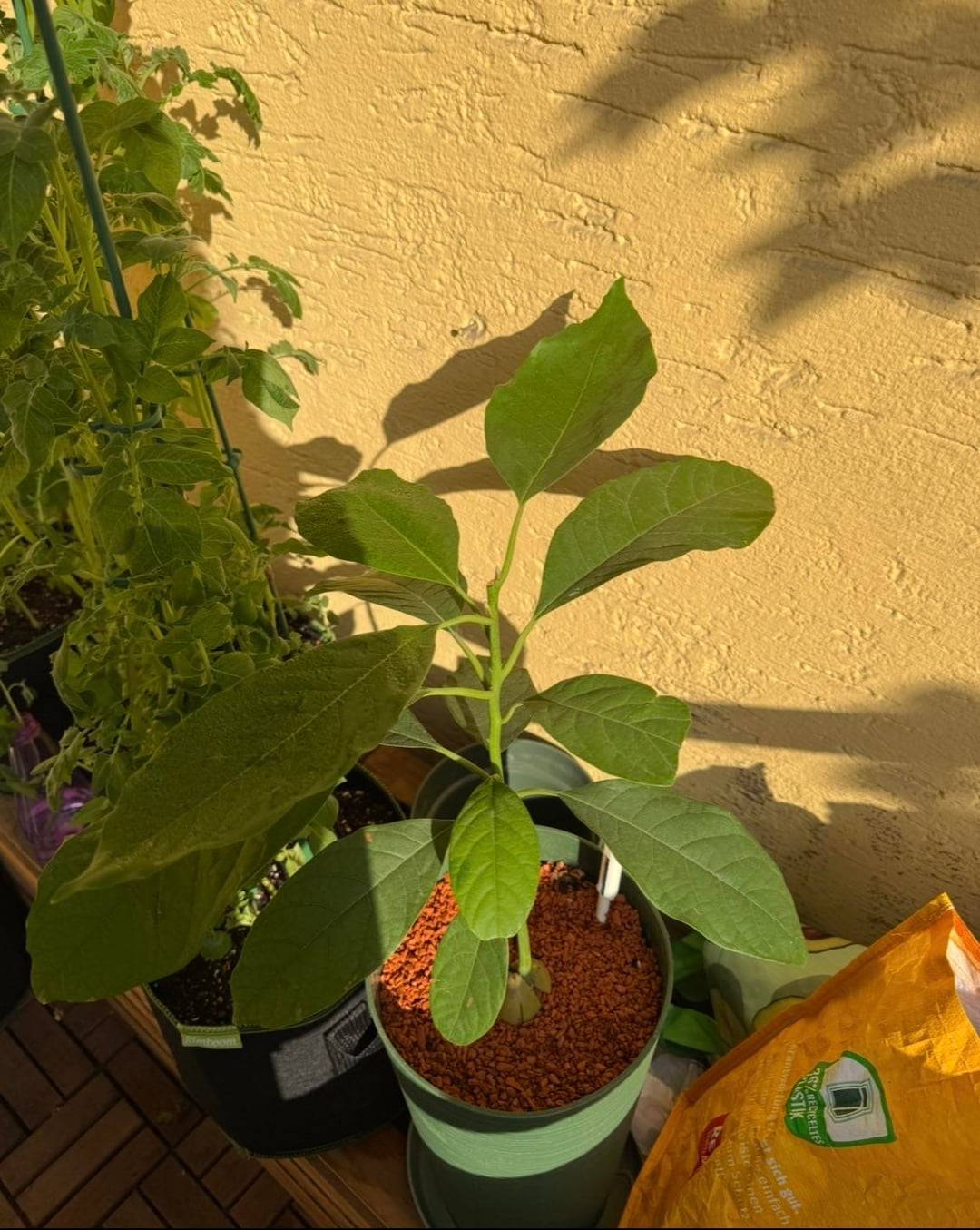 Meine Avocadopflanze ist etwa 1,5 Jahre alt. Letzten Sommer blühte es prächtig, es wuchsen neue Blätter und nach dem Beschneiden sogar ein neuer Zweig.