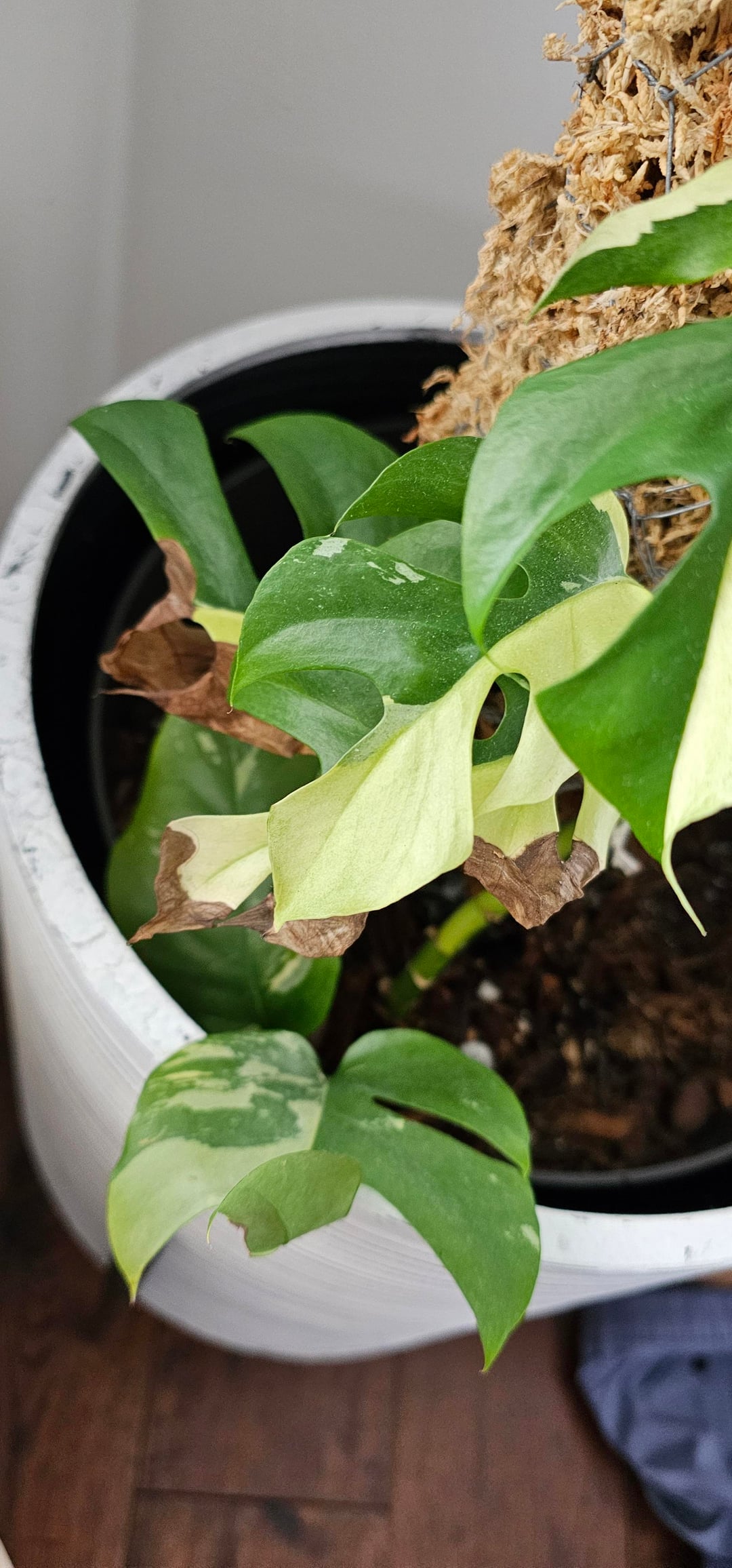 Ich hoffe, dass jemand mit einem grüneren Daumen als ich helfen kann. Ich habe dieses bunte Mini-Monstera vor etwa einem Jahr gekauft. Es hatte nur 3 Blätter und hat sehr oft neue Blätter geschossen. Mein Problem ist, dass der bunte (weiße) Teil der Blätter immer etwa zwei Wochen nach ihrer vollständigen Reife braun wird. Im Moment ist es auf ein Südostfenster ausgerichtet.