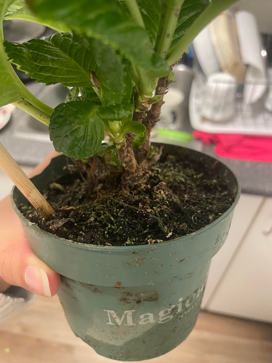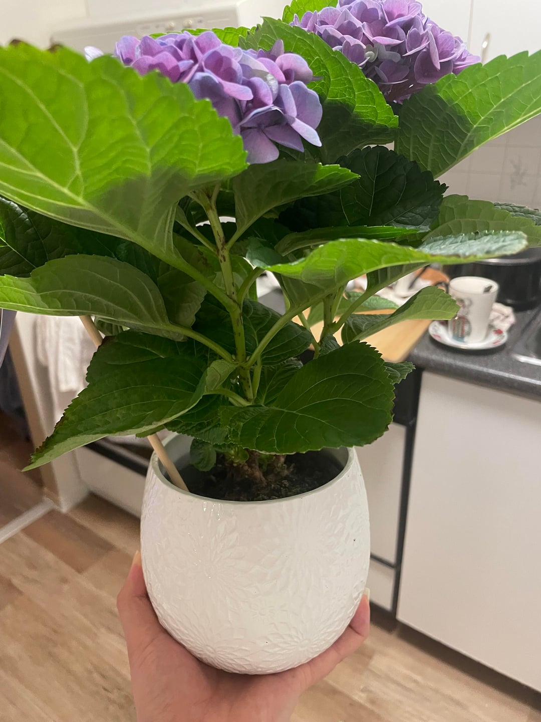 • Die Hortensie befindet sich in einem Topf mit Drainage und dieser befindet sich in einem dekorativen Topf.