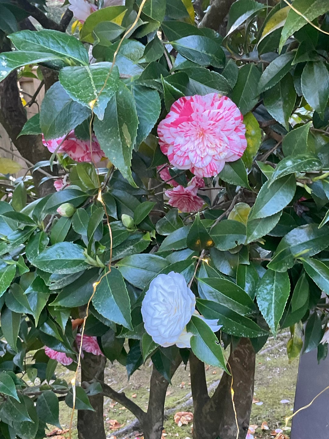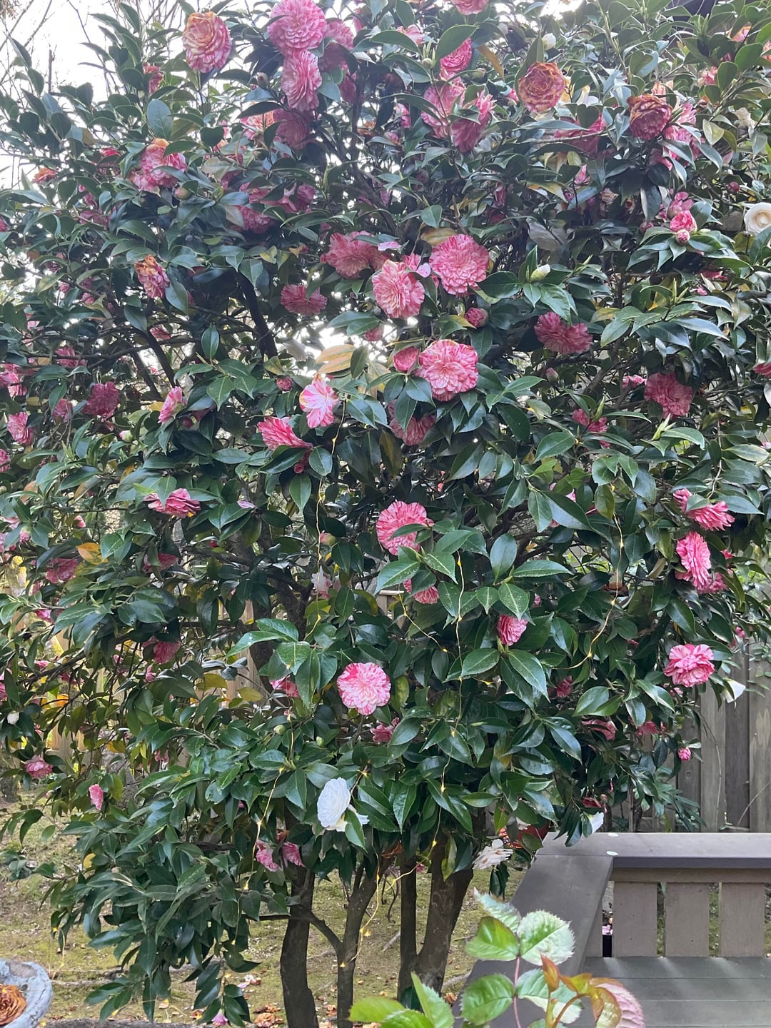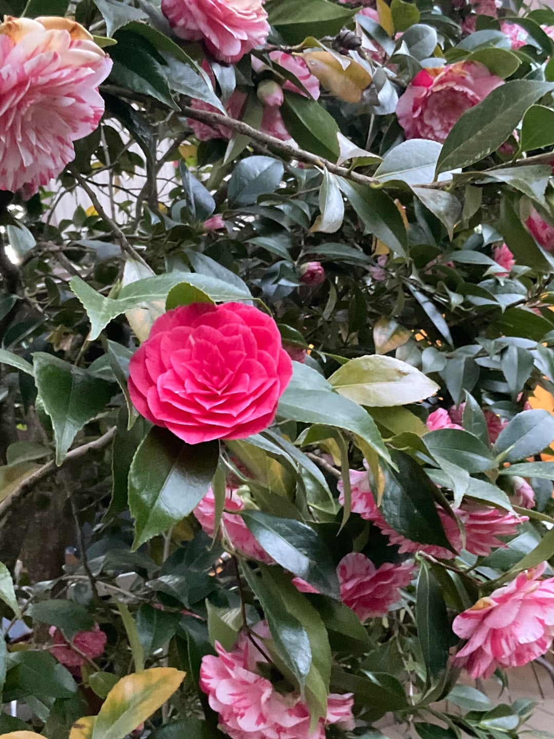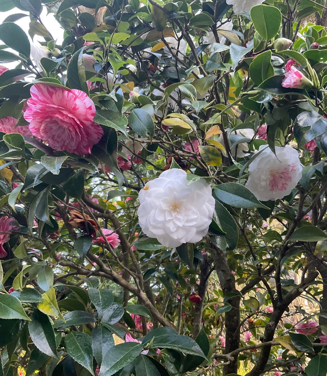 Es ist April und unsere Kamelie steht in voller Blüte. Sie ist so zuverlässig, dass sie Jahr für Jahr immer eine Fülle von Blumen liefert. Und das in vielen verschiedenen Farben, Rot, Weiß, Rosa und in vielen verschiedenen Kombinationen dazwischen. Eine Freude anzusehen.