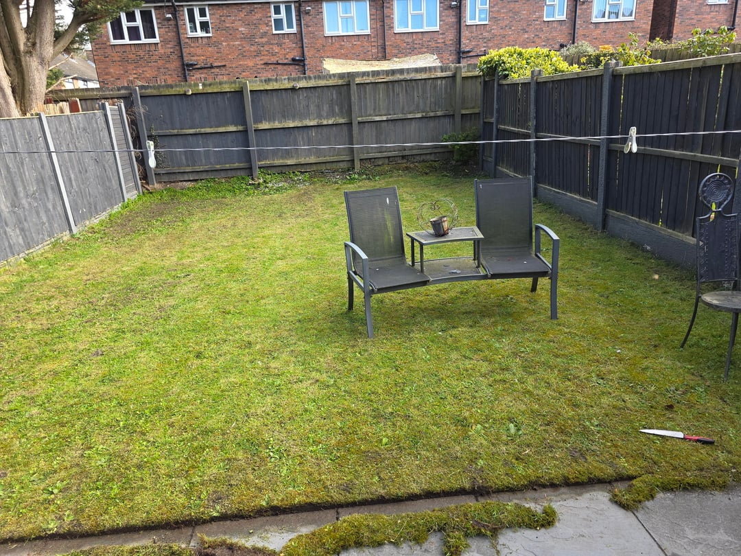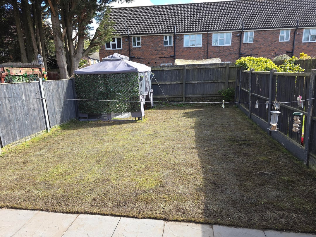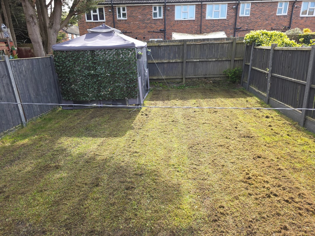 Ich habe den Rasen gemäht und ein paar Tage später etwas Nachschnitt-All-in-One-Unkraut- und Düngemittel, Moosvernichter und Rasendünger hinzugefügt. Ein paar Tage später (vielleicht 3/4/5, ich bin mir nicht ganz sicher) habe ich den Rasen vertikutiert und geharkt (fast eine ganze 240-Liter-Mülltonne gefüllt), und obwohl noch einige moosige Stellen übrig sind, bin ich angenehm überrascht, wie viel Gras tatsächlich noch übrig ist, obwohl es insgesamt eher schlammig und fleckig ist.