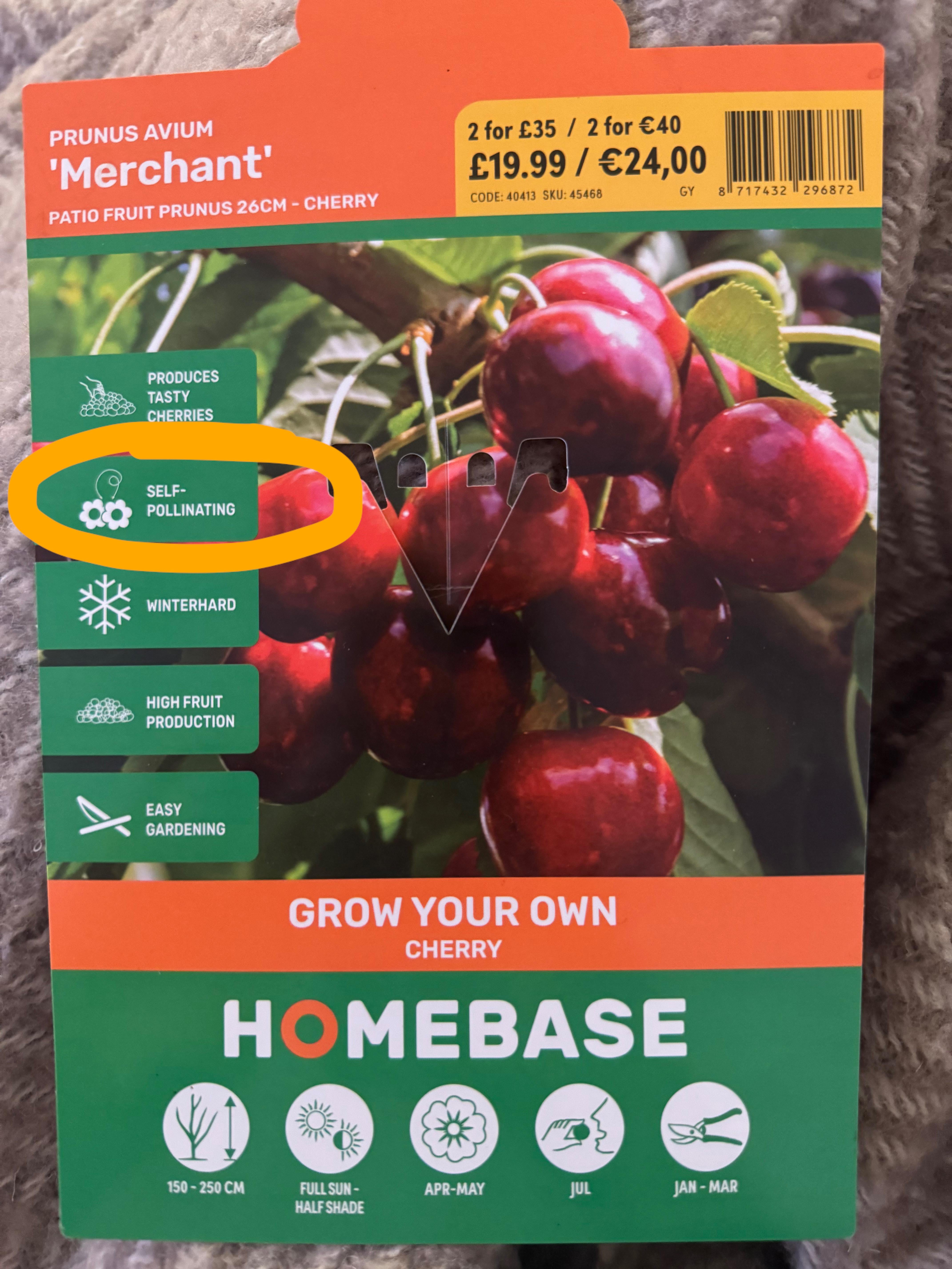 Ich habe am Wochenende eine Terrassenkirsche (Prunus Avium „Merchant“) bei Homebase gekauft und auf dem Etikett steht, dass sie selbstbestäubend ist.