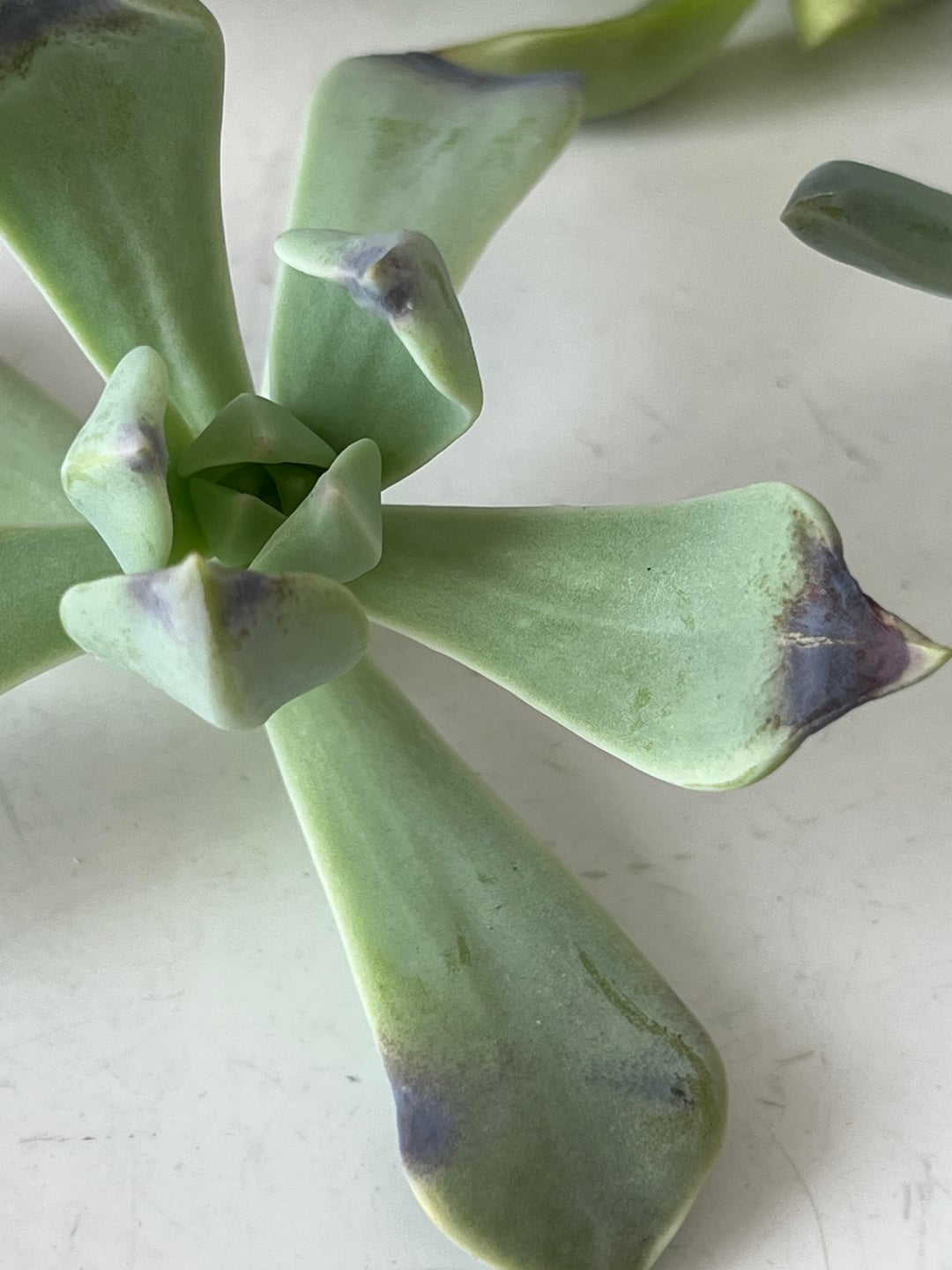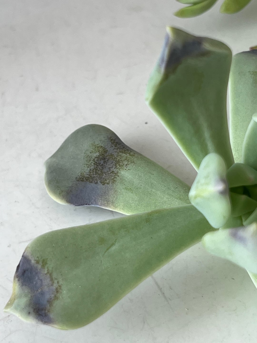 Ich bin nur neugierig Was ist das? violette Flecken an der Blattspitze? Ich bin mir ziemlich sicher, dass sich dort etwas Wasser angesammelt hat, als es draußen war. Glauben Sie, dass der Sonnenbrand die Ursache dafür ist? Wassertropfen fungierte es als Linse oder war es vielleicht in einer der kälteren Nächte eingefroren?