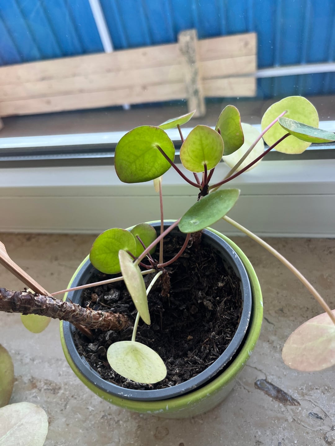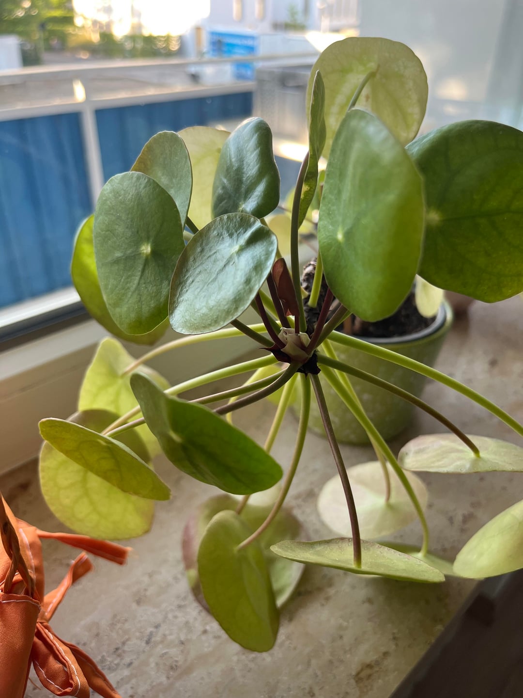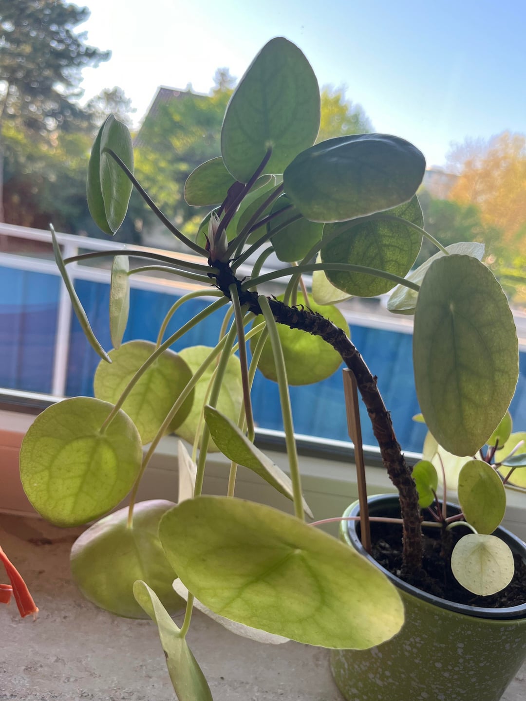Steht auf dem Fensterbrett der Südseite. Die bereitet mir große Sorge. Am Anfang war sie sehr schön grün und happy und danach ist sie immer gelblicher geworden. Ich habe die Pflanze bereits irgendwo schattiger hingestellt aber da war sie auch nicht glücklich. Sie wurde 1x umgetopft vor ca. 1-1,5 Jahre von den Vorbesitzern und hat auch diesen kleinen Ableger bekommen.