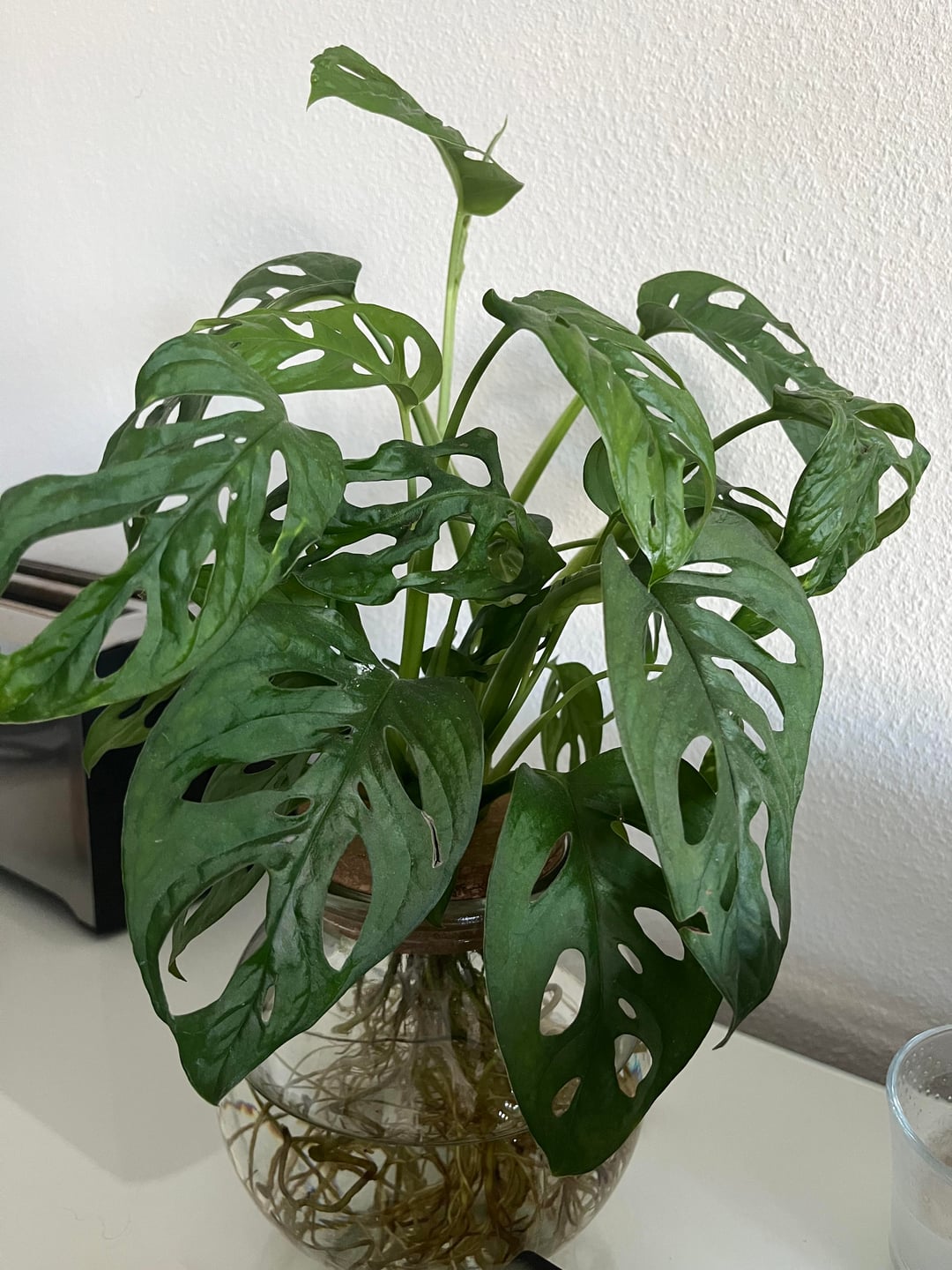 Monstera die ich in einem Glas gekauft habe. Ich wechsel alle 2 Wochen das Wasser. Steht im Raum das auf der Südseite steht, allerdings nicht direkt am Fenster, sondern am anderen Ende des Raumes. Bei ihr sehe ich erstmal keine Probleme. Die zerknitterten Blätter waren beim Kauf da, die anderen wachsen schön(er) nach.