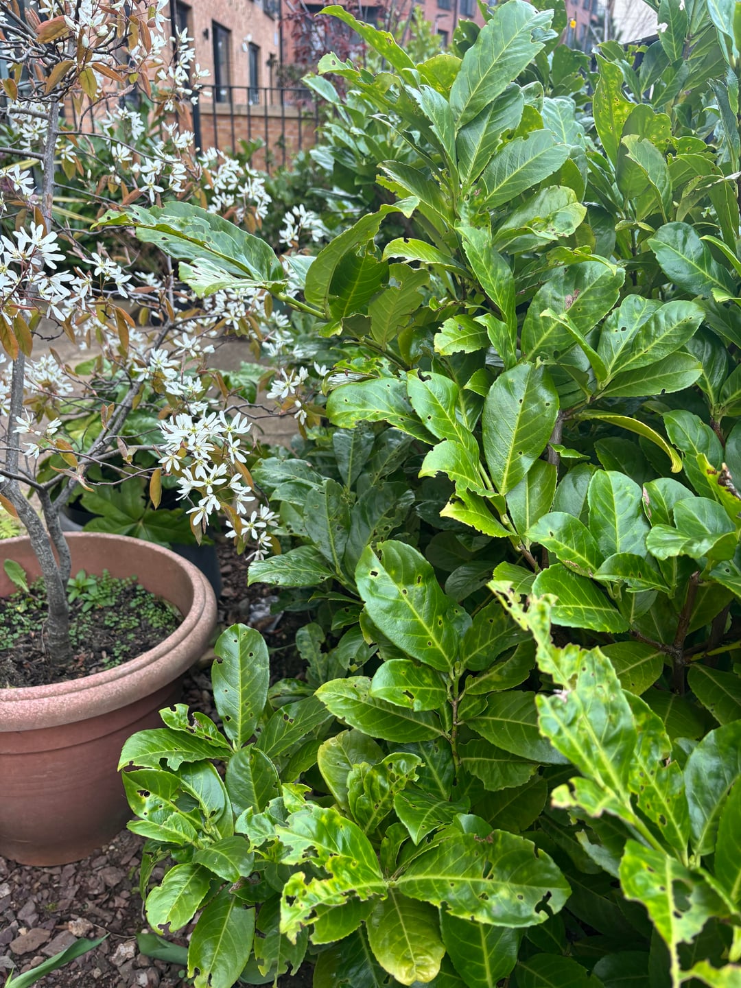 Wir haben diese Lorbeerhecke vor etwa drei Jahren in unserem relativ neuen Gebäudekomplex gepflanzt, da wir dringend etwas Grün brauchten. Aber es geht überhaupt nicht gut, es sieht absolut schrecklich aus! Ich glaube nicht, dass das Blatt voll ist!