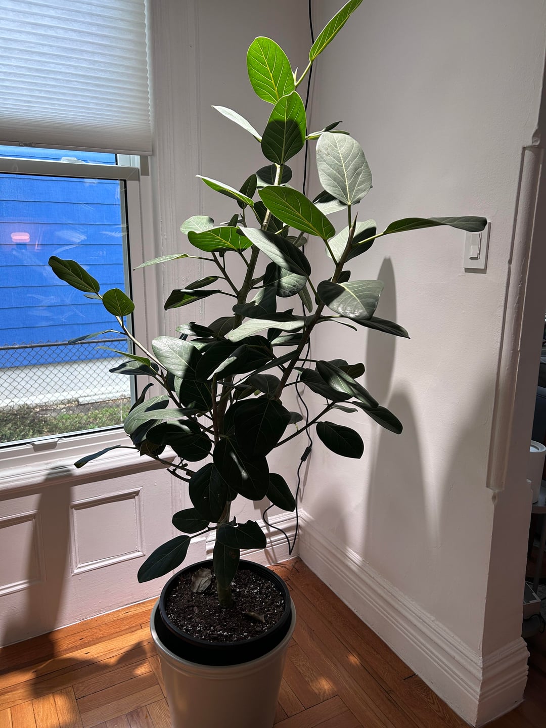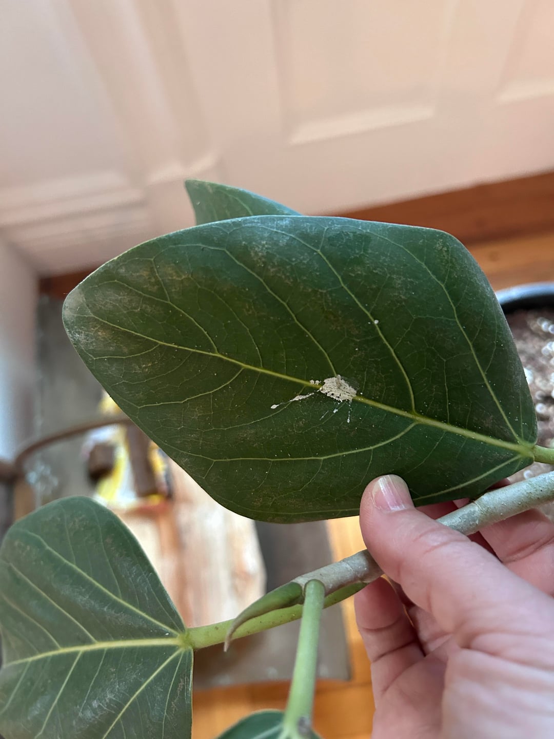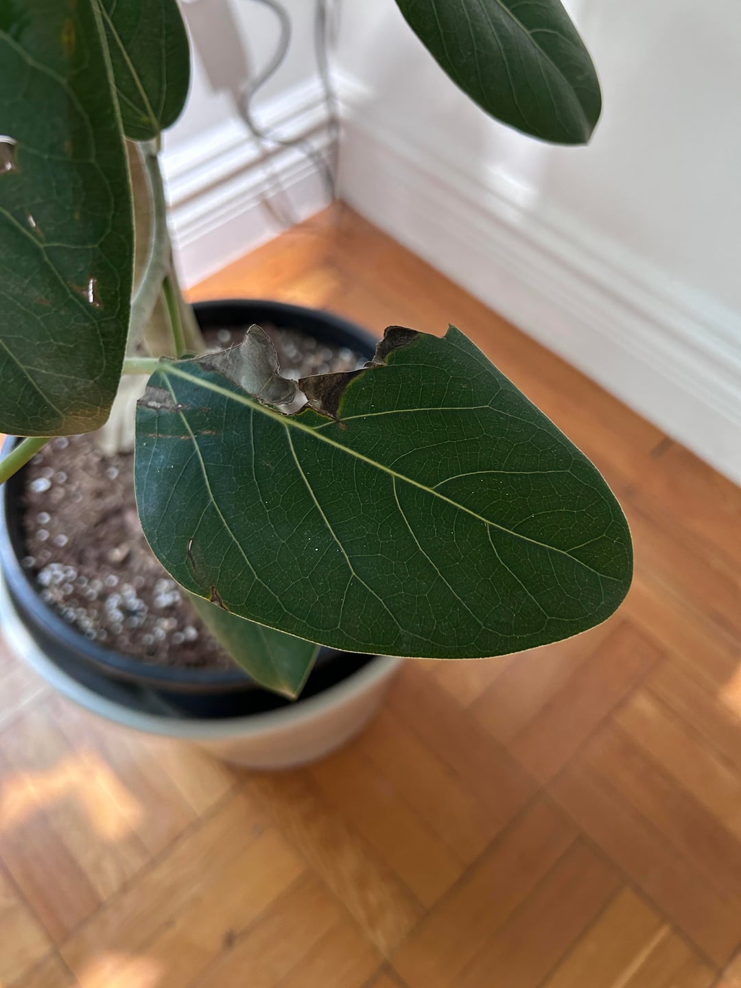 Was passiert mit meinem neuen Audrey-Ficus? Einige Blätter sind abgefressen, ein paar sind getrocknet und heruntergefallen, und ich habe auf einigen Blättern weißes Zeug gefunden (sieht fast aus wie Vogelkot, ist aber nicht klar!). Sind es Wollläuse? Echter Mehltau? noch etwas? Der Baum ist über 1,50 m hoch und wurde erst vor etwa einem Monat gekauft. Wir haben einfach eine Wachstumslampe angebracht, da sie nicht das beste Licht abgibt … und ich hatte in der Vergangenheit bei größeren Pflanzen nicht das größte Glück. Aber wir sind wirklich daran interessiert, diese Schönheit am Leben und Gedeihen zu erhalten! Wie mache ich das?? Danke schön!