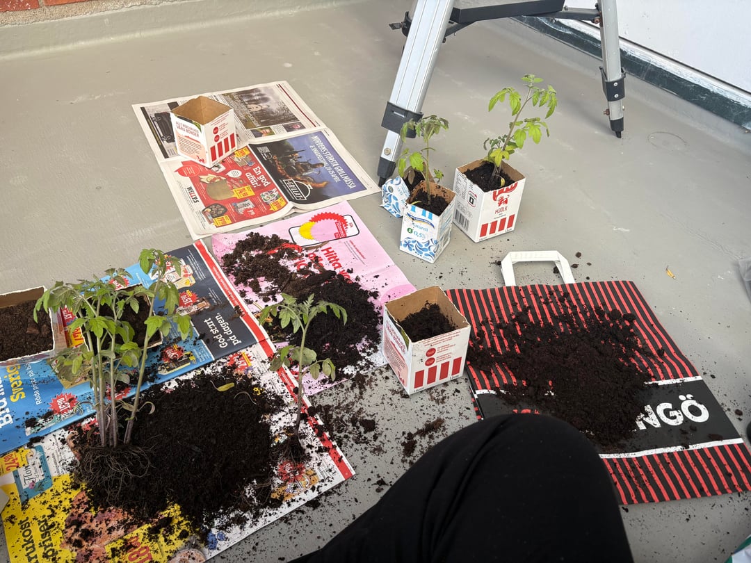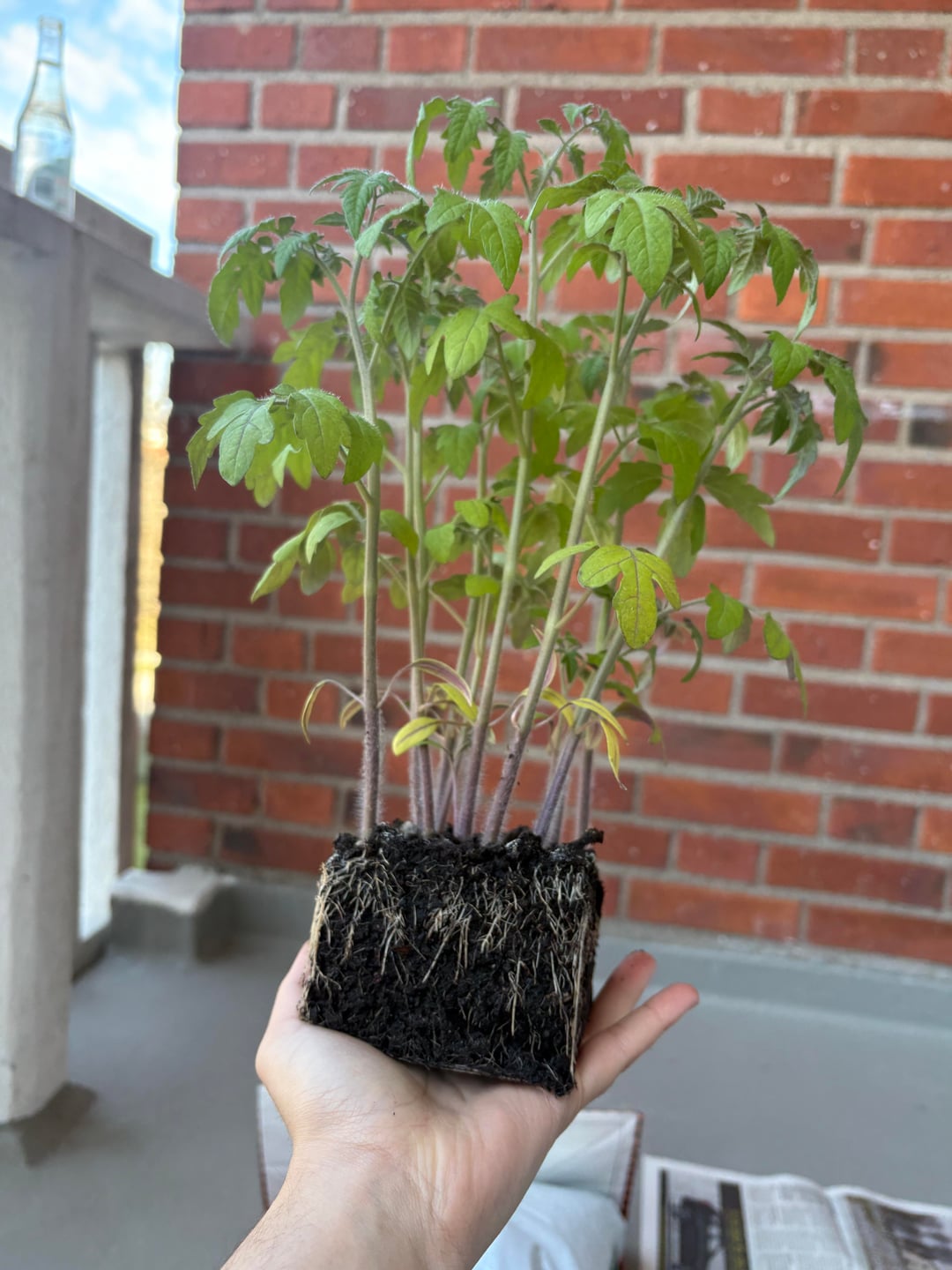 Hallo! Das erste Mal, dass ich wirklich etwas mit Pflanzen mache, habe ich vor ein paar Wochen ein paar Tomatensamen gepflanzt, und sie standen neben meinem Schlafzimmerfenster, und jetzt habe ich sie neu gepflanzt, und ich habe eigentlich keinen Platz, wo ich sie hinstellen kann, außer auf meinem Balkon. Wenn es Nacht ist, kann ich sie hineinbringen und auf den Boden legen, aber tagsüber gibt es keinen anderen Ort.