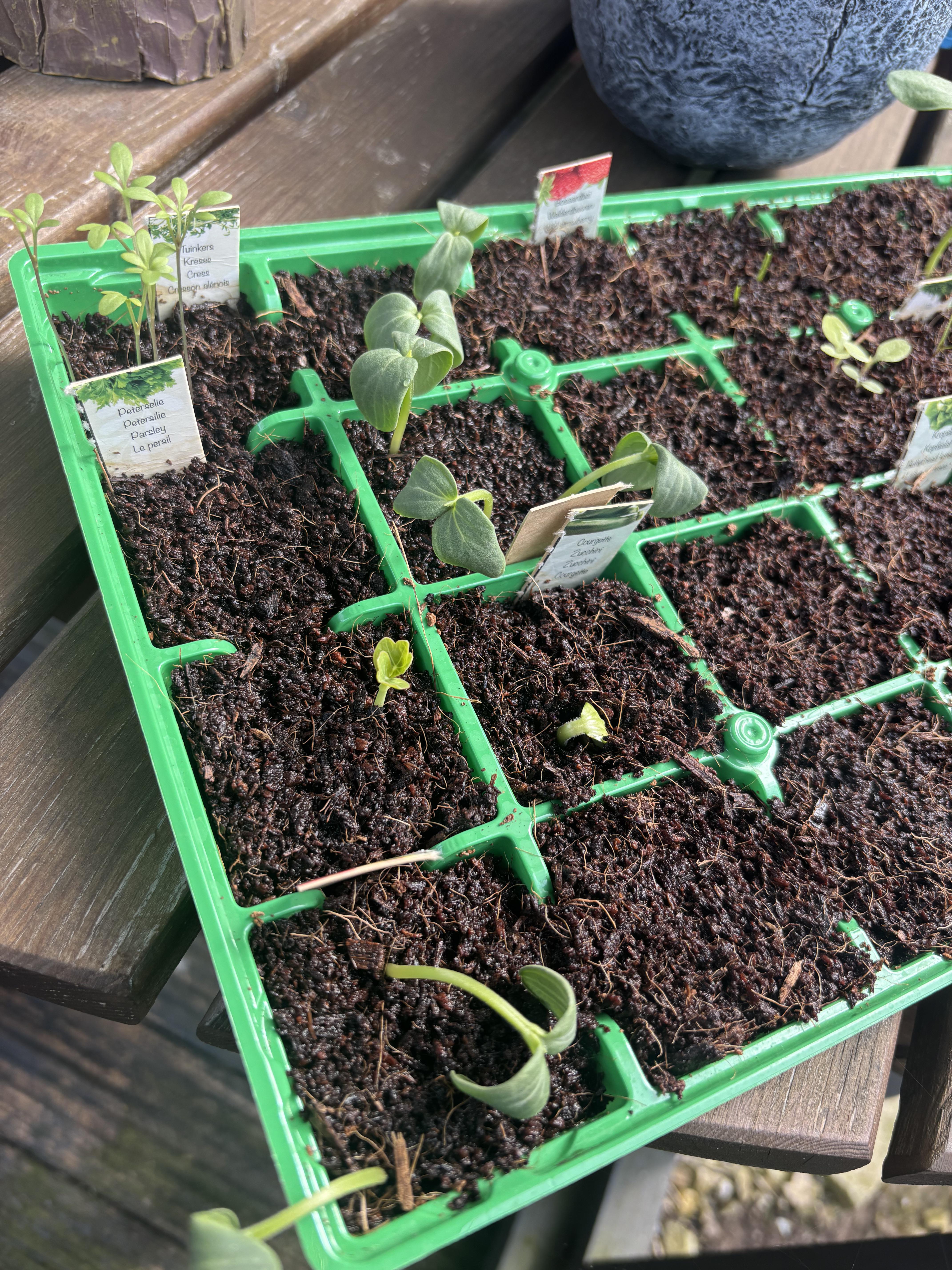 Ich habe mit der Aussaat drinnen begonnen, dann ein kleines Gewächshaus gekauft und dann den Behälter nach draußen gebracht. Als ich heute Morgen hinausging, um zu sehen, wie es läuft, waren meine Gurken gerade und sahen sehr gesund aus. Ich ging in ein paar Stunden wieder raus und alle sahen irgendwie deprimiert aus.