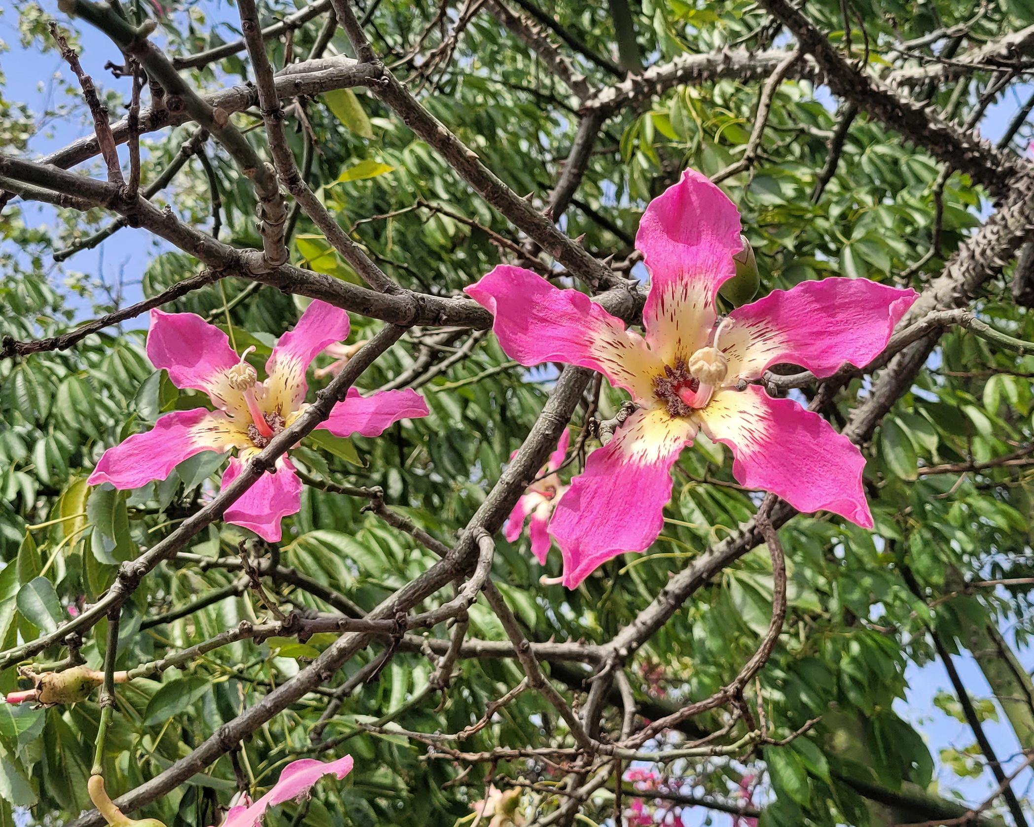 Diese Blume stammt von a Seidenseidenbaum (Ceiba speciosa), erkennbar an seinen leuchtend rosa Blütenblättern und der elfenbeinweißen Mitte. Es handelt sich um eine atemberaubende tropische Art, die der Landschaft im Herbst einen herrlichen Farbtupfer verleiht. 🌳