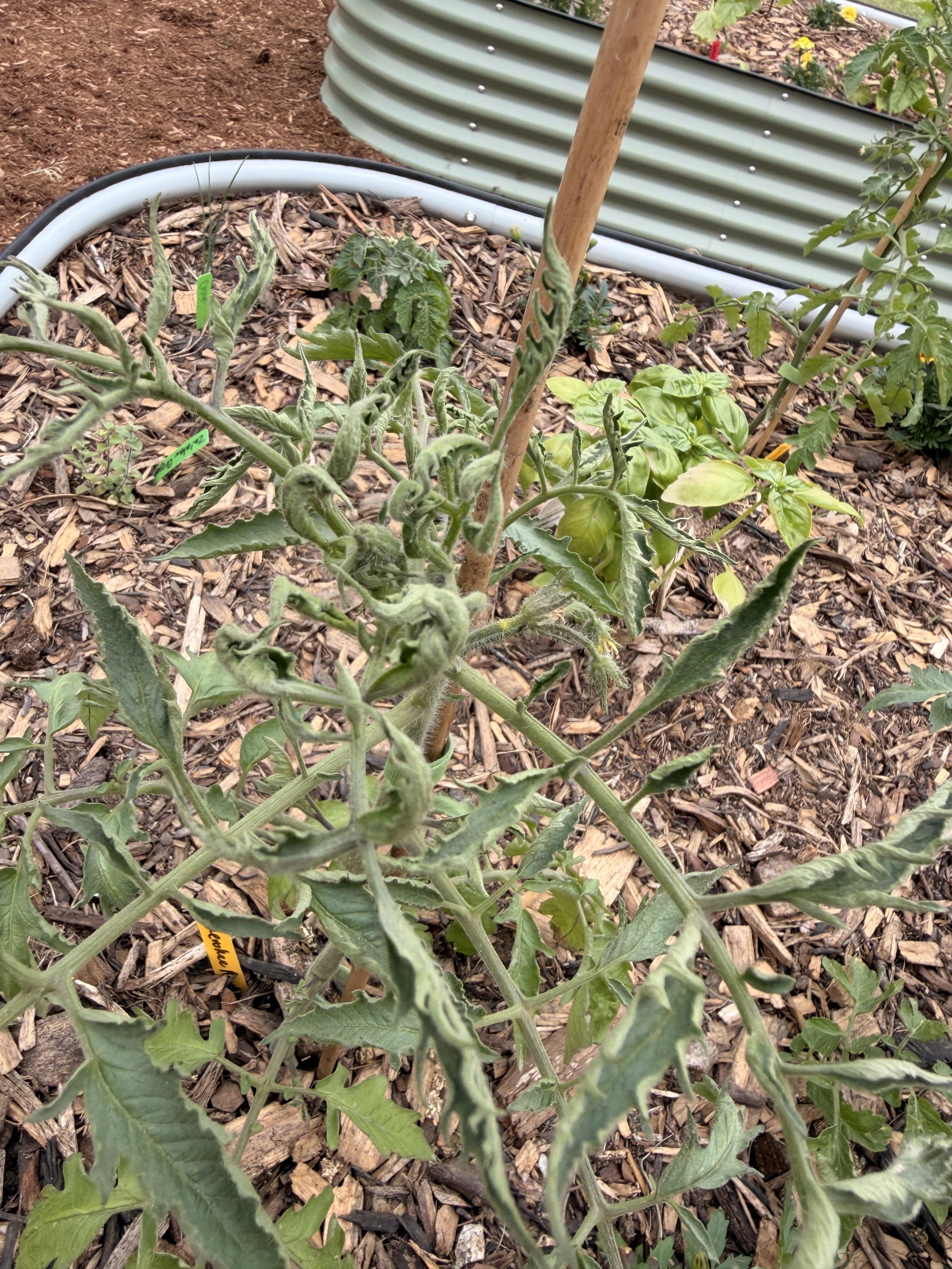 Ich habe vor etwa zwei Wochen 10 Tomaten in meine Hochbeete gepflanzt und sie haben begonnen, sich in unterschiedlichem Maße auf diese Weise zu kräuseln. Ich habe sie mit dem toten Käfer von Captain Jack besprüht, aber so etwas habe ich noch nie gesehen. Insbesondere dieser Cherokee Purple ist das schlechteste Beispiel. Ich habe noch nie gesehen, dass sich neues Wachstum bei einer Tomate so kräuselt. Den anderen Pflanzen in den umliegenden Hochbeeten scheint es gut zu gehen? Sieht nicht nach Thripsschaden aus, aber vielleicht irre ich mich? Helfen.
