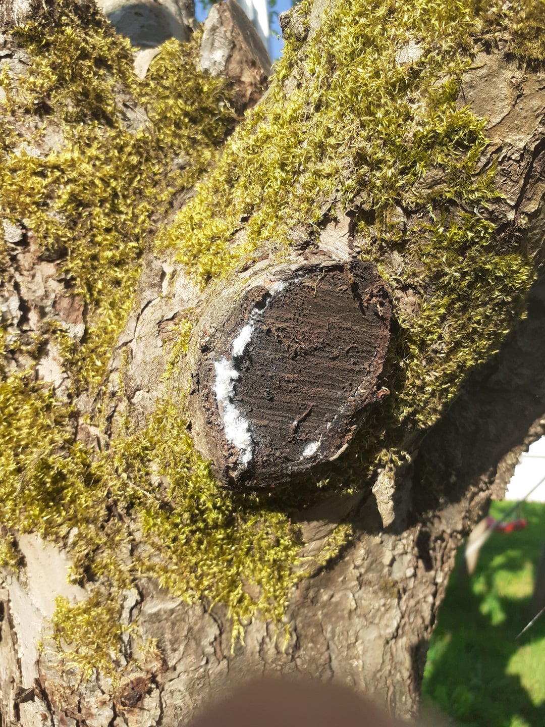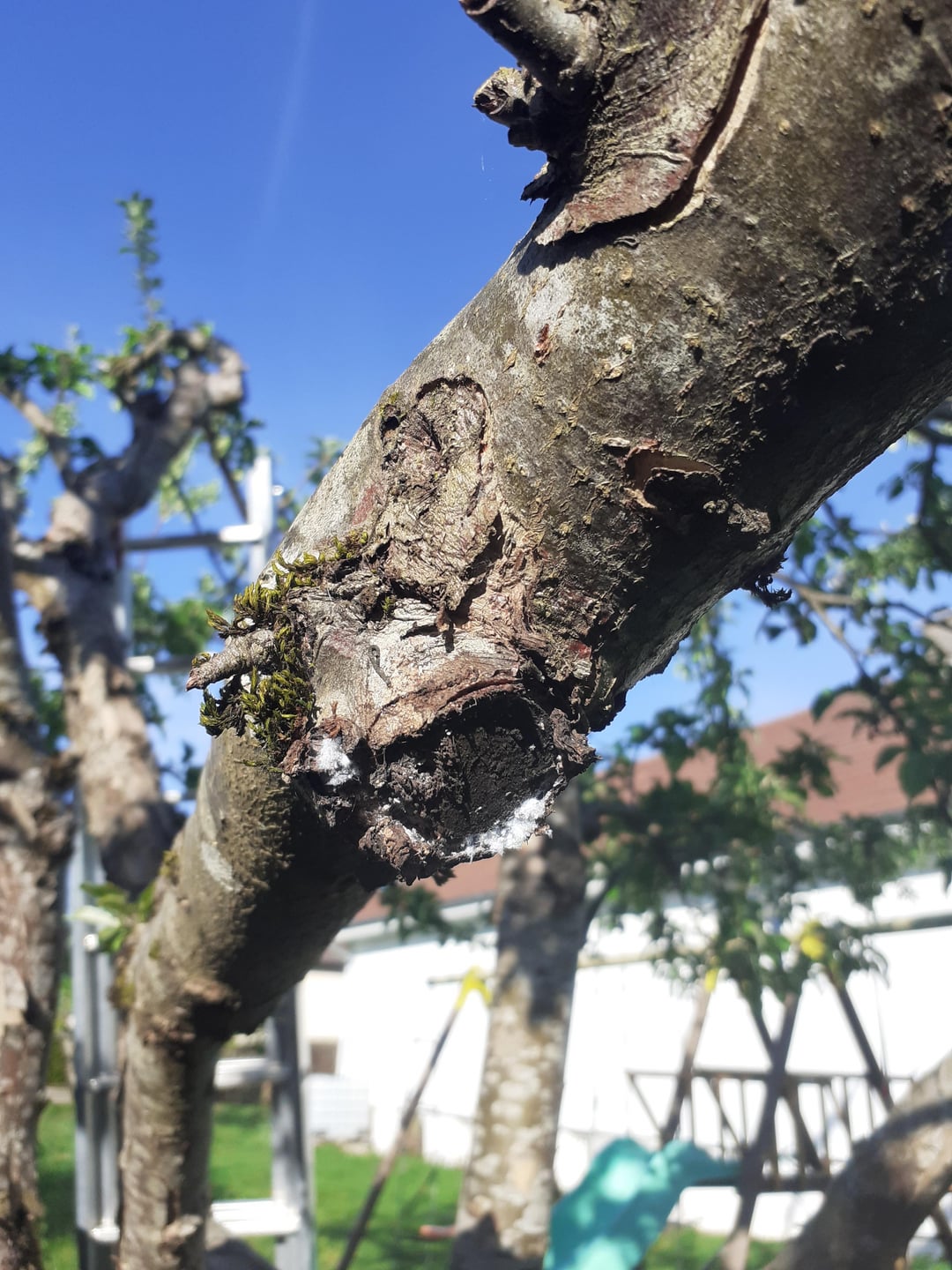 Heute sind mir auf einigen Narben im Schatten weißliche, wattige Massen aufgefallen. Ist es ein Pilz? Wollläuse? Wie gehe ich damit um, um zu verhindern, dass mein wunderschöner Apfelbaum von so einem außerirdischen Fleck gefressen wird?