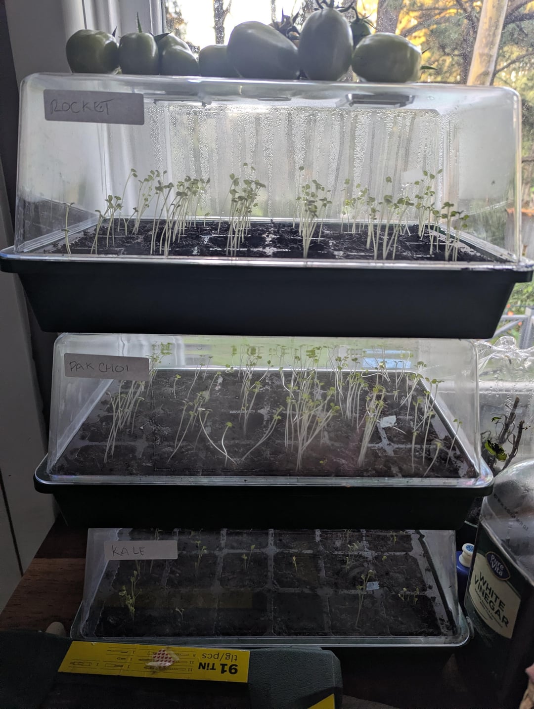 Ich bewahre sie drinnen am Fenster auf, weil ich keine überdachte Stelle habe, um sie vor dem Regen zu schützen, und diese kleinen Gewächshäuser einfach mit Wasser überschwemmt werden.