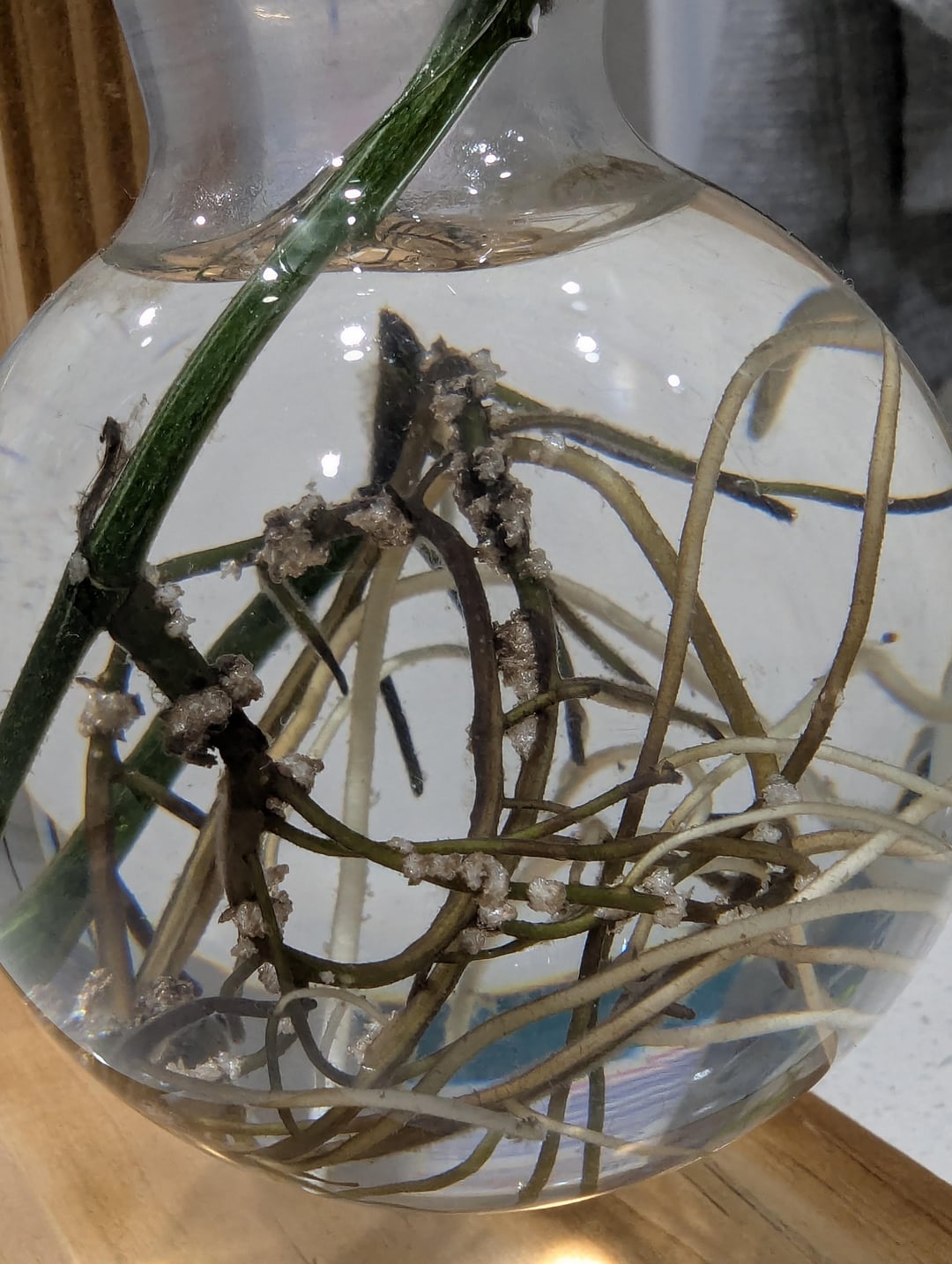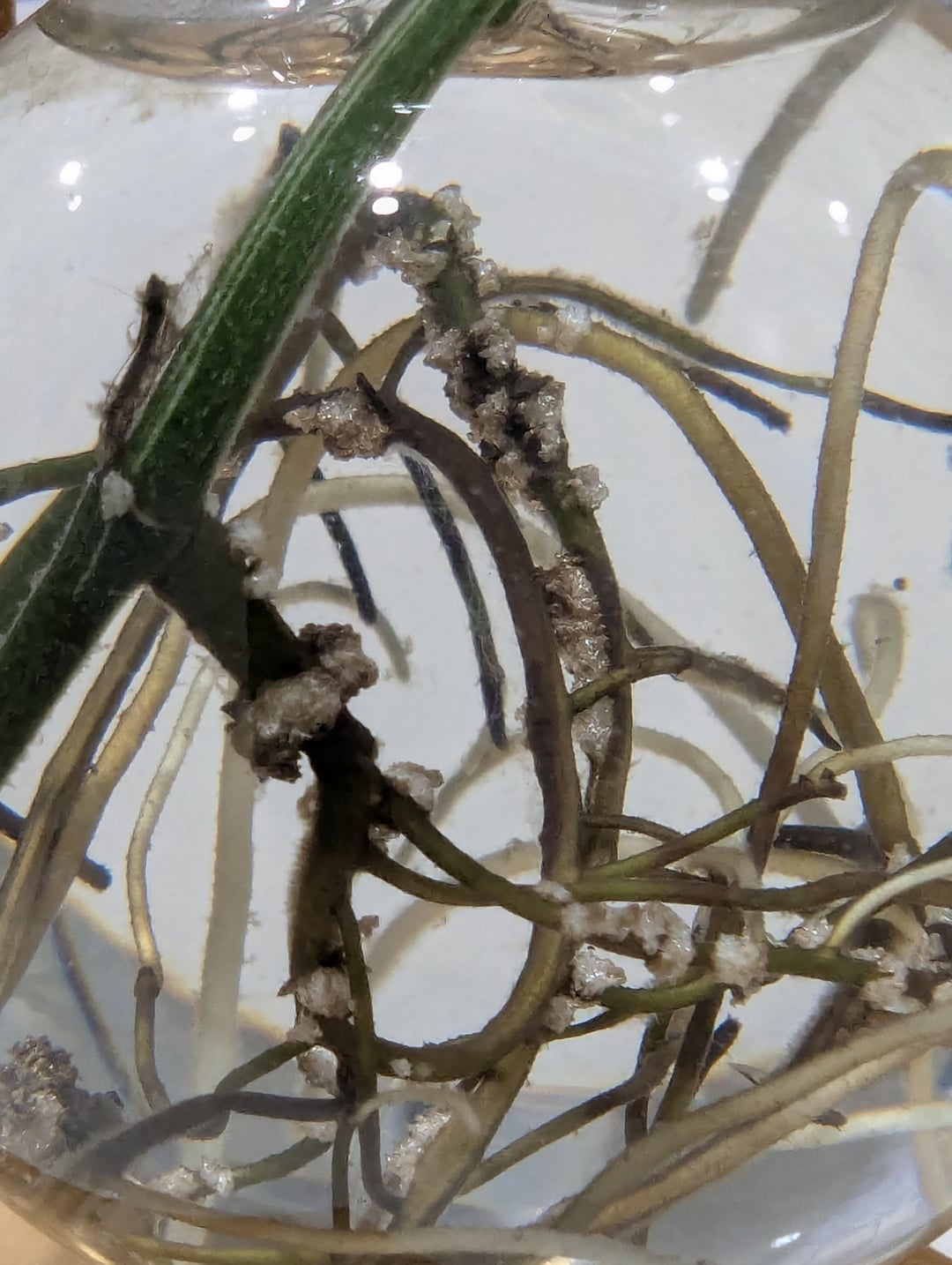 Auch wenn es längst überfällig für einen etwas größeren Behälter ist (vermute ich), habe ich etwas Angst davor, was diese kleinen, weißen, fast kristallinen Beulen entlang der Wurzeln sind. Etwas zum Kontext: Das Wasser wurde alle 14 Tage ein bis zwei Mal durch ein wenig wasserpflanzenspezifischen Dünger ersetzt und ist erst kürzlich dazu übergegangen, gefiltertes Wasser anstelle von reinem Leitungswasser zu verwenden. Ich bin ungefähr zwei Monate lang glücklich unter einer Wachstumslampe gewachsen, und nachdem ich sie eine Woche lang stehen gelassen habe, ist sie wieder voll mit neuem Wurzelwachstum, aber auch einer ganzen Reihe dieser kleinen kristallinen Beulen. Ich behaupte, dass es nicht so schlimm sein kann, da die letzte Woche wahnsinnig in Sachen Wurzelwachstum war (und ein neues Blatt auftauchte), aber es ist auch ziemlich besorgniserregend, denn was zum Teufel ist das???