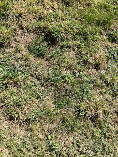 Vor zwei Wochen habe ich zwei Pflanzen wilden Thymians in einer Böschung zu Hause gepflanzt (auf dem Foto sind es die beiden grüneren Stellen). Es handelt sich um eine steile Böschung Richtung Westen (Sonne bis etwa 17 Uhr, dann im Schatten des Hauses), auf der derzeit eine ganze Reihe Graspflanzen wachsen (Kuhgras, winzige Blumen usw.), die aber abgestorben und trocken werden, sobald es zu heiß wird.