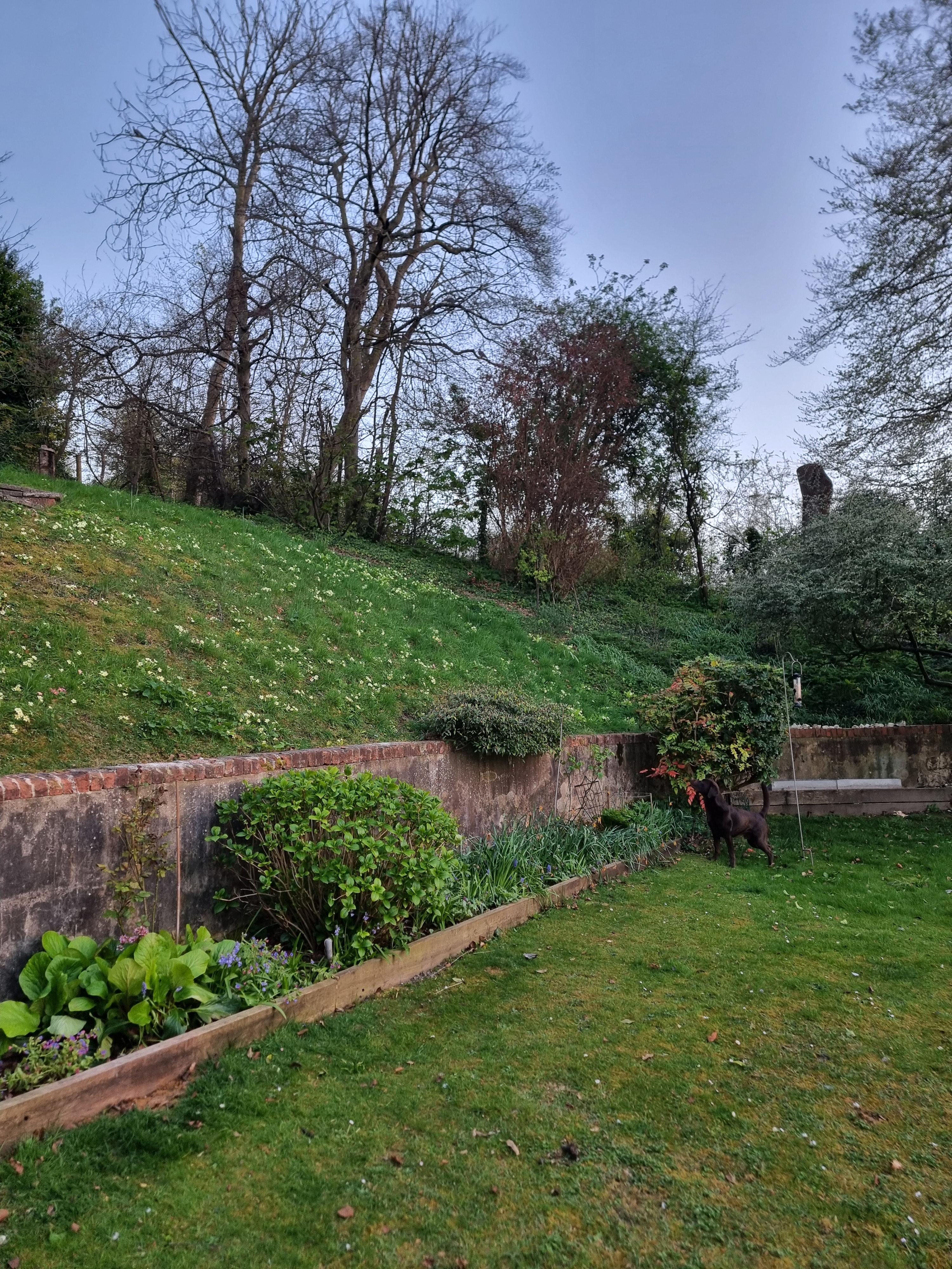 Die Böschung hinter dem Vogelhäuschen war ein Teppich aus Schneeglöckchen, und jetzt ist die Böschung auf der linken Seite voller Primeln!
