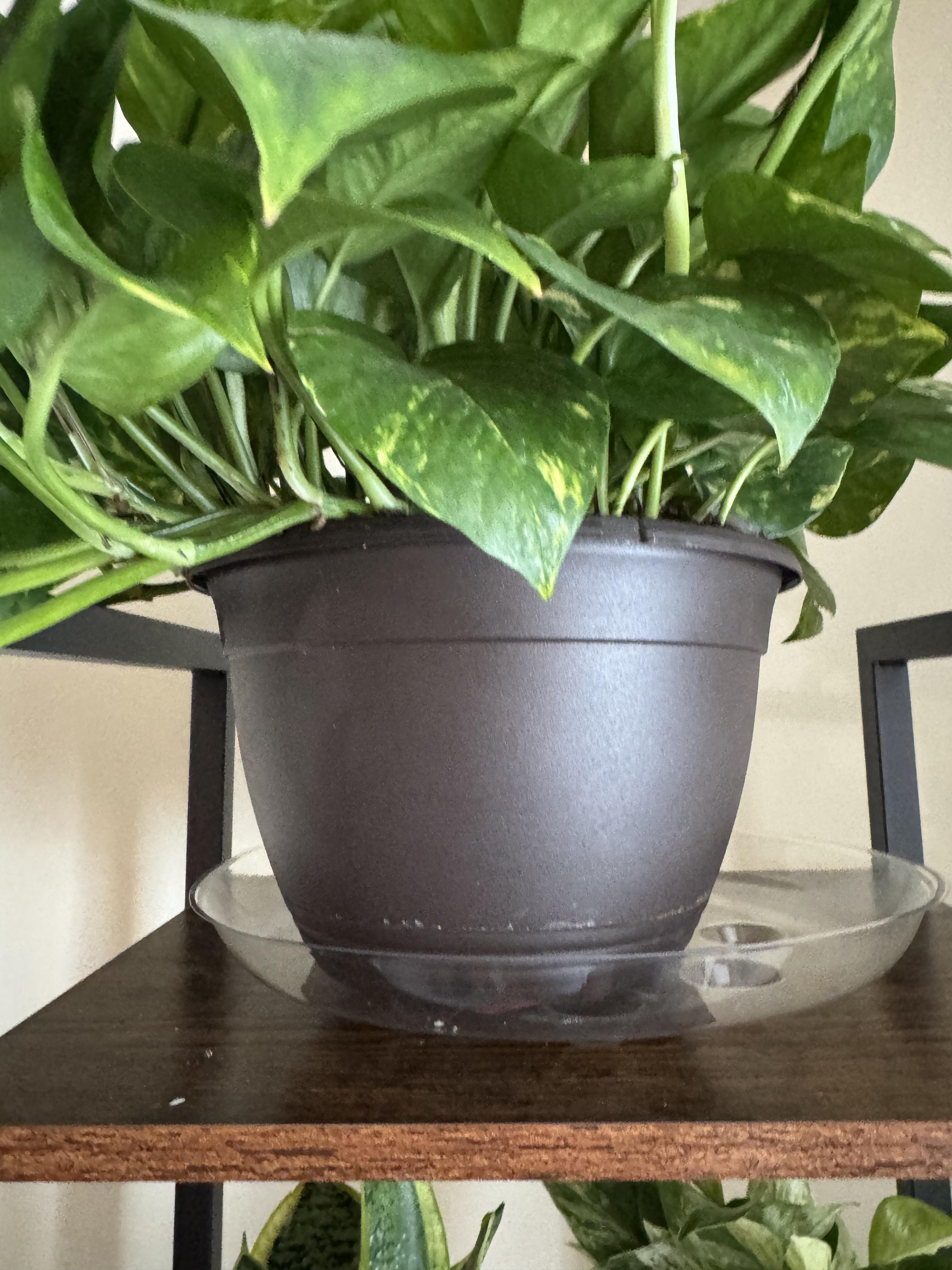 Ich habe also meine Pothos-Pflanze, die bald umgetopft werden muss. Sie befindet sich in dem Topf, in dem sie aus dem Laden kam. Ich habe sie gemessen. Ich habe unten einen Durchmesser von 9 und eine Höhe von 6, was ich in einen Topfrechner eingegeben habe, und es ist ein 4-Liter-/1-Gallonen-Topf.