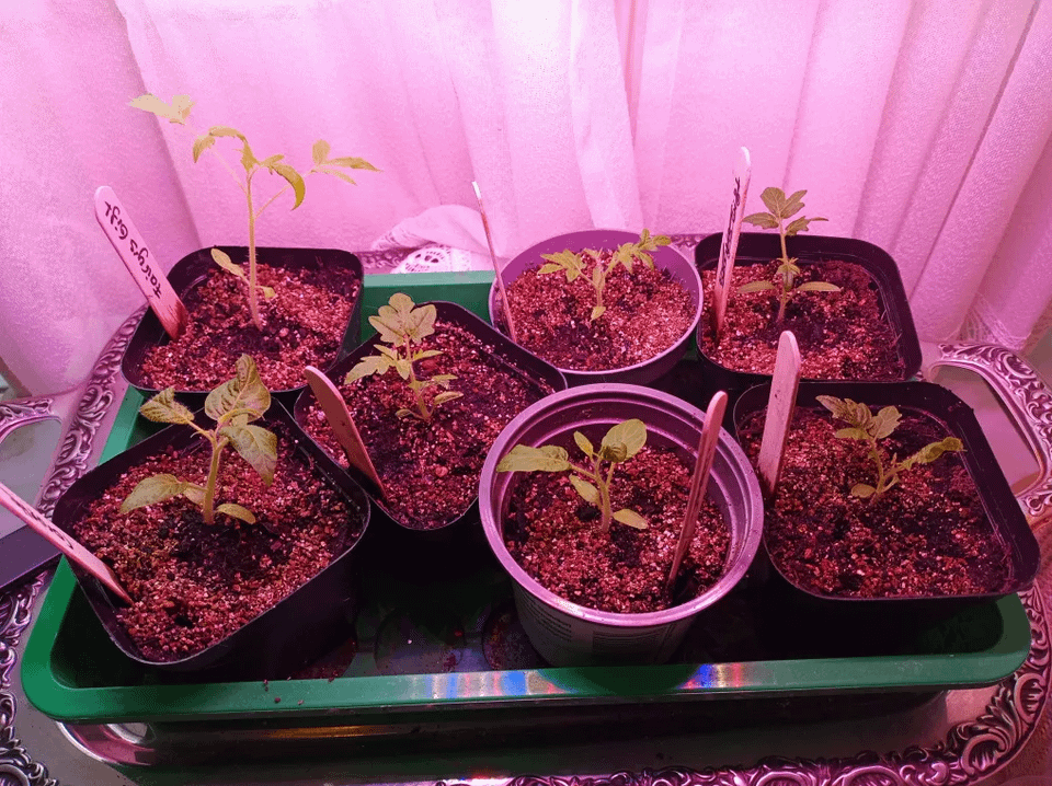 - In Grün (Minigewächshaus; Wohnzimmer) habe ich eine 'bunte' Lampe (wobei man auch den Lichtmodus ändern kann, aber weiß war sehr blass) und zusätzlich etwas Tageslicht.