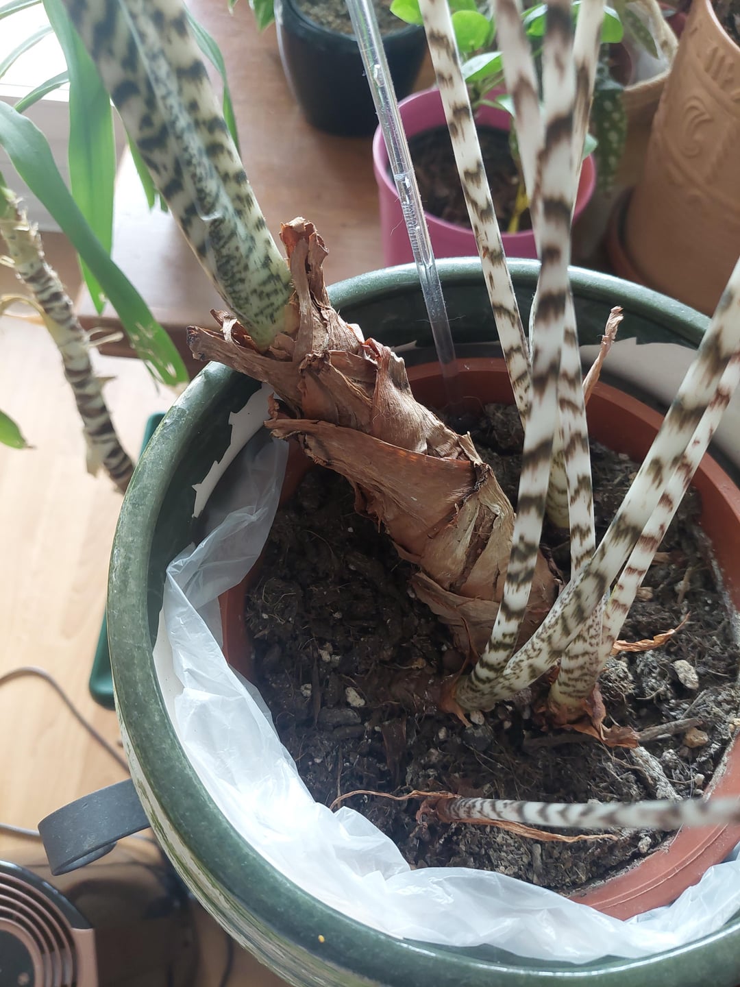 Meine Hauptfrage beschäftigt sich mit der größten Pflanze und ihrem Stamm. Ich habe noch nie so eine alte Alocasia neu eingepflanzt. Aus Videos habe ich die Info, dass man sie tiefer rein setzt, da sie aus dem ganzen unteren Stamm noch Wurzeln sprießen lassen kann. (Das ist auch nötig. Sie hat kaum Wurzeln, steht nur durch die Stütze und wäre beim Transport fast rausgefallen. Die Arme hängt an der seidenen Wurzel).
