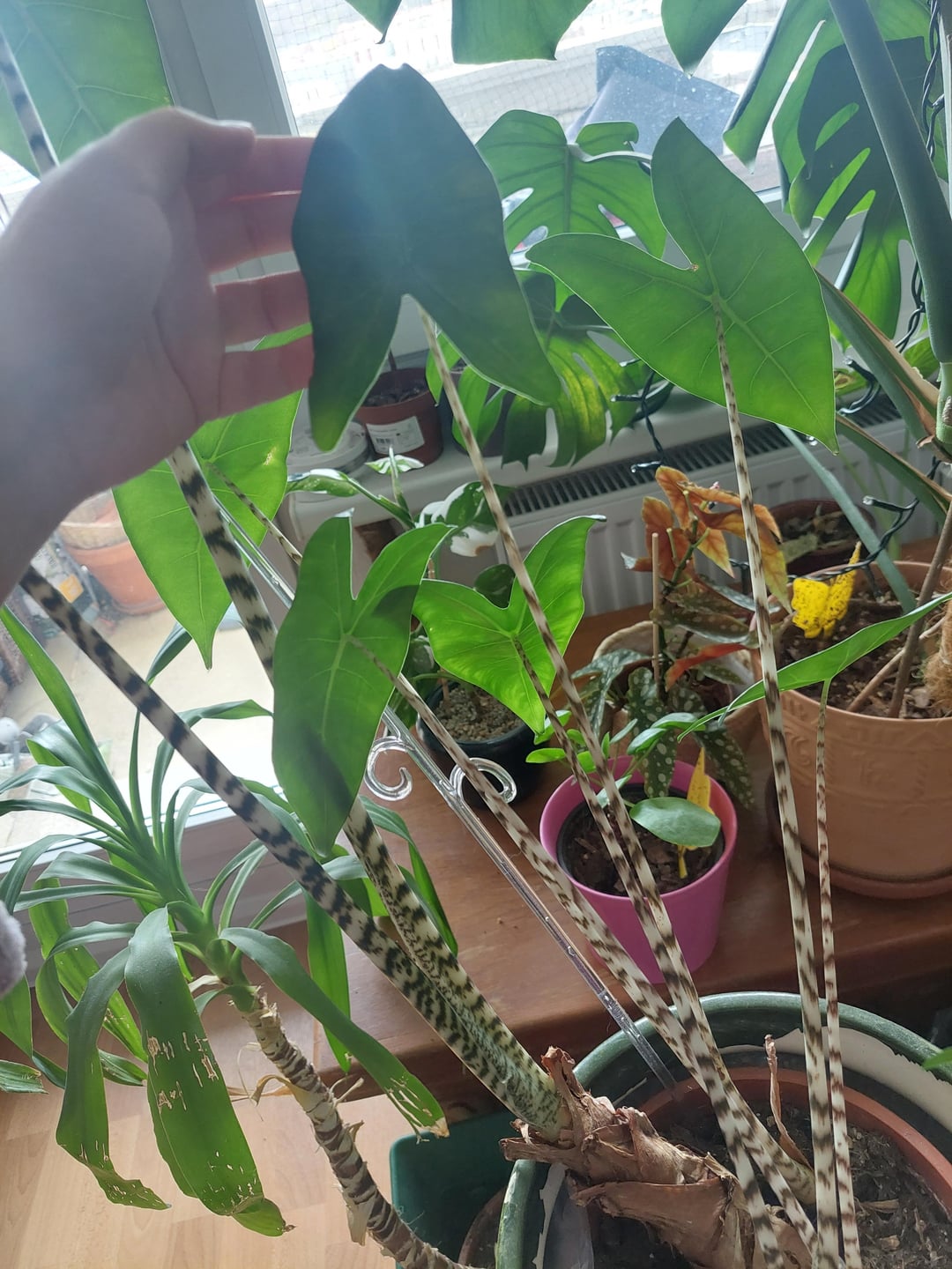 Zur Überbrückung stehen gerade ein paar Pflanzen von einem befreundeten Pärchen bei mir und unter ihnen diese Alocasia Zebrina.